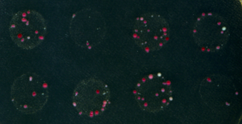 Picture 4. Image of part of a plate selecting for C-BOE suppressors of the essential gene rhb1. Red colonies are rhb1-bypassed clones that have lost the counter-selectable plasmid, and white colonies are clones with the counter-selectable marker mutated.