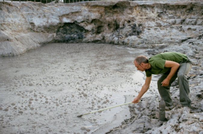 Image 1: Sampling by dr. Arjan Pol in the natural environment of strain SolV: a mud pool at the Solfatara near Naples (Italy).