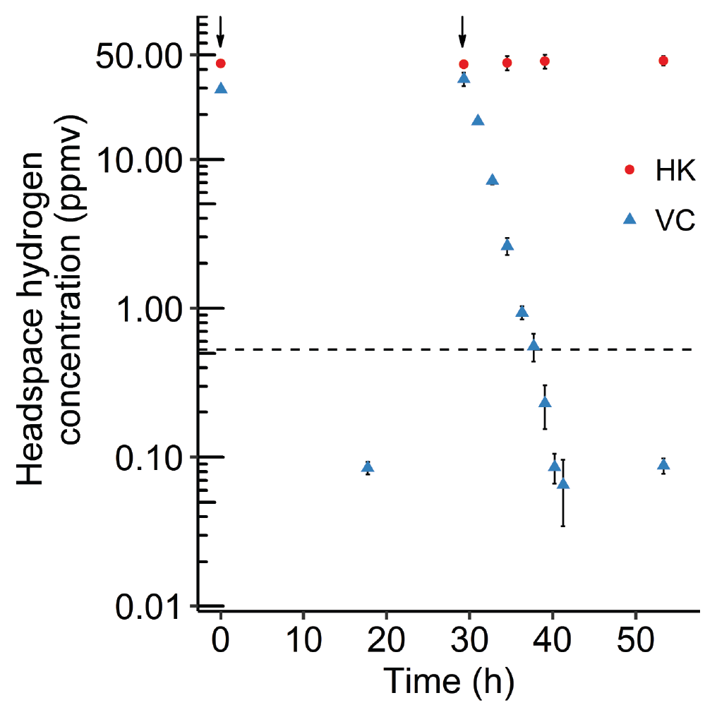 Image 2: Subatmospheric H2 oxidation by Hyd-1h in cells of Methylacidiphilum fumariolicum SolV. The dashed line indicates the atmospheric H2 concentration (0.53 ppmv). The arrows indicate when hydrogen gas was added. 120 mL capped serum bottles were inoculated with 10 mL (OD600 = 0.12) heat-killed cells (HK) or viable cells (VC). At 29 h, H2 was again supplemented to VC. Error bars indicate standard deviations (n=3).