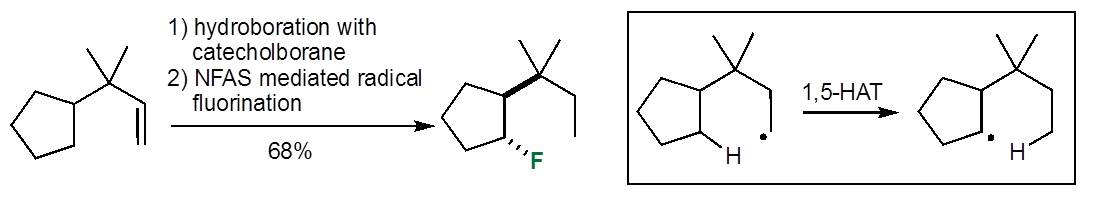 These reagents have been optimized to decrease as much as possible the N–F bond dissociation energy and to minimize the electrophilic character. This task was challenging because we were also looking for reagents that are stable and easily prepared. Fortunately, N-arylsulfonamides bearing at least one electron withdrawing substituent such as a trifluoromethyl group on the aryl moiety were found to be easily N-fluorinated and to afford stable N-fluoro-N-arylsulfonamides (NFASs). Thanks to their very weak N–F bond dissociation energies, BDEs of 220.0–226.1 kJ mol–1 have been calculated, NFASs were shown to be behave extremely well in radical fluorination of a wide range of secondary and tertiary alkyl radicals. The early nature of the transition state and the importance of polar effects is highlighted by theoretical calculations. The radical mediated hydrofluorination of alkenes via formation of the corresponding B-alkylcatecholboranes that worked poorly with NFSI or Selectfluor® becomes efficient when NFASs are used. The utility of the reaction was demonstrated by a remote fluorination involving a 1,5-hydrogen atom transfer from a primary to a secondary alkyl radical.