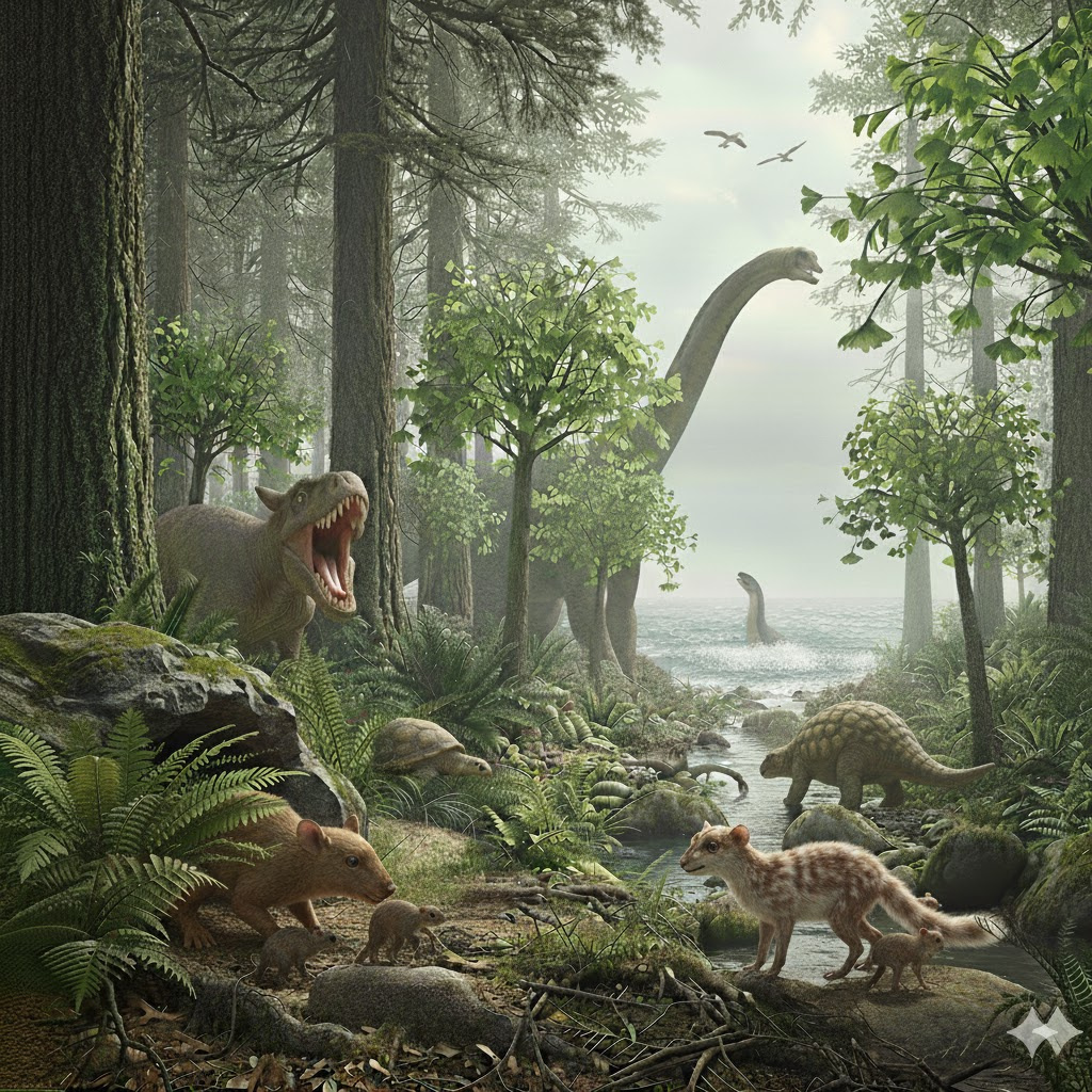 Multituberculates were extinct mammals that diversified and spread across a planet very different from today’s. The warmer and more humid climate of the Mesozoic fostered ecosystems unlike those of the present, with vegetation dominated by conifers, cycads, ginkgos, and ferns, and a rich fauna whose most familiar representatives were the herbivorous dinosaurs (sauropods and ornithischians), the carnivorous theropods, and the flying reptiles known as pterosaurs.