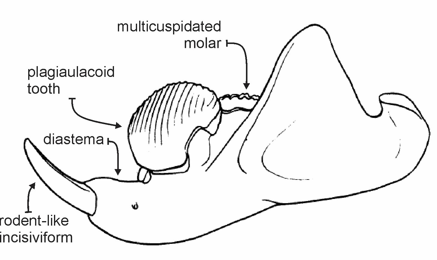 In many species, a large, ridged, blade-like tooth—known as a plagiaulacoid tooth—was often present in the lower jaw, just in front of the molariforms. This dental specialization likely served to slice or crush hard items such as arthropod shells, tough fruits, and seeds, or to cut small plant shoots. This tooth worked in concert with a unique chewing motion, in which the mandible moved from front to back (palinal), unlike in most other mammals, where jaw movement is primarily backward–forward or transverse.