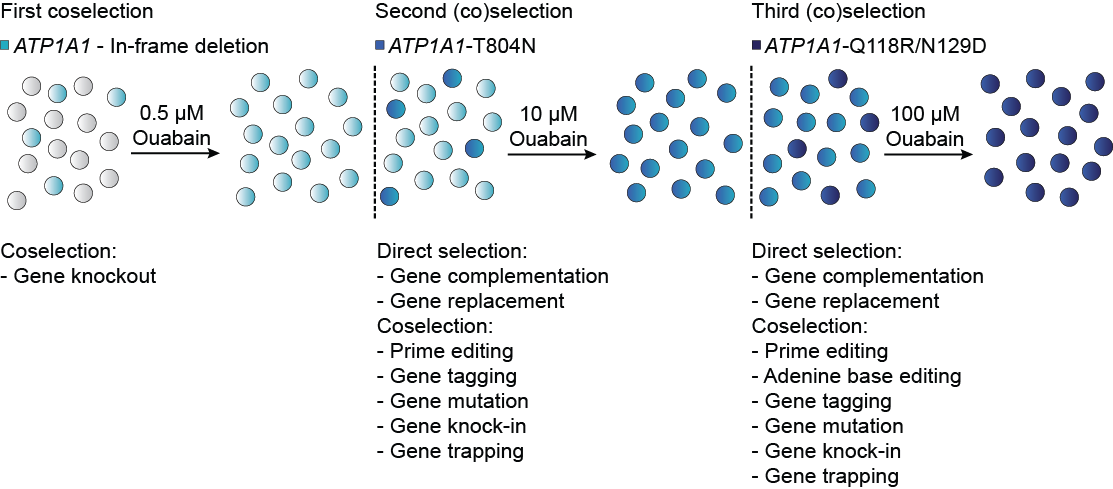 Targeting ATP1A1 successively allows up to three rounds of marker-free selection.