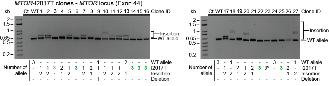 We then designed new pegRNAs to install clinically relevant mutations at MTOR. Using a stable cell line expressing a fluorescent mTORC1 signaling reporter, we readily isolated single cell-derived clones homozygous for the intended mutations and displaying hyperactivation and/or drug resistance. Interestingly, we observed frequent large insertions when running the PCR amplicons on gels. In fact, most clones that were not homozygous for the intended mutation harbored large insertions that could reach up to 1 kb. We then further characterized these outcomes and found that these outcomes are dictated by the polarity of the ssDNA overhangs released after paired nicking, which depends on the relative orientation of the protospacer adjacent motifs (PAMs) from the pegRNA and the nick sgRNA. When PAMs are facing outwards relative to each other, large insertions composed of tandem duplications were observed while larger deletions were observed when PAMs were facing inward relative to each other.