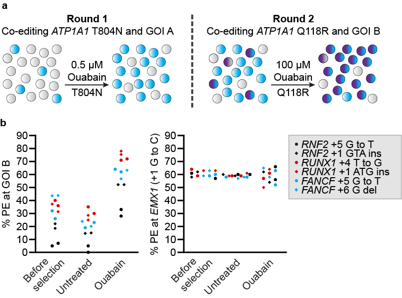 Back in 2018, the CRISPR prime editing technology was still in development. Building on previous work from our lab, we started exploring the possibility that the sodium/potassium pump could be engineered in succession to create variants that are progressively more resistant to ouabain. Taking advantage of a long history of random mutagenesis studies that mapped amino acid residues that alter ouabain sensitivity, we introduced point mutations and in-frame deletions at the third extracellular loop of the pump. While monitoring cell growth with increasing concentrations of ouabain, we observed a wide range of levels of resistance. To put things in perspective, a concentration of 0.5 µM ouabain is sufficient to kill human cells in culture within 48 hours. Cells harboring an in-frame deletion at ATP1A1 exon 4 or 17 that encode for the first and third extracellular loops, respectively, only allowed cells to grow robustly with ˂ 5 µM ouabain. On the other hand, cells that harbored the T804N mutation could grow robustly with up to 10 µM, and cells that harbored both Q118R and N129D mutations, which are naturally occurring in rodents, could grow in the presence of 1000 µM ouabain. Hence, we hypothesized that these mutations could be introduced sequentially to perform successive rounds of marker-free selection.