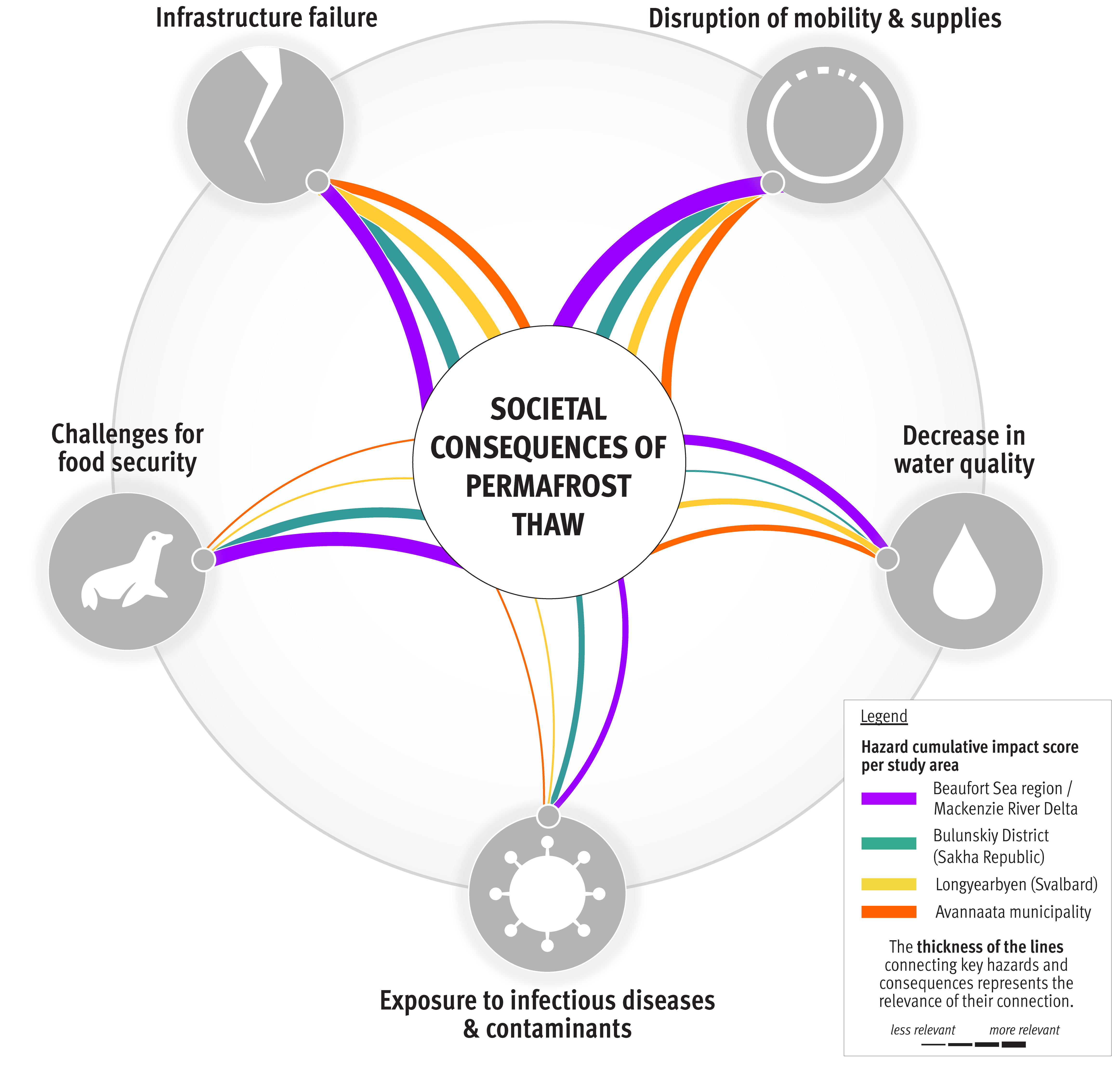 A figure from our paper illustrates the severity of societal consequences resulting from five identified permafrost thaw hazards, as perceived by local communities and researchers. Read the full paper to see all of our findings.