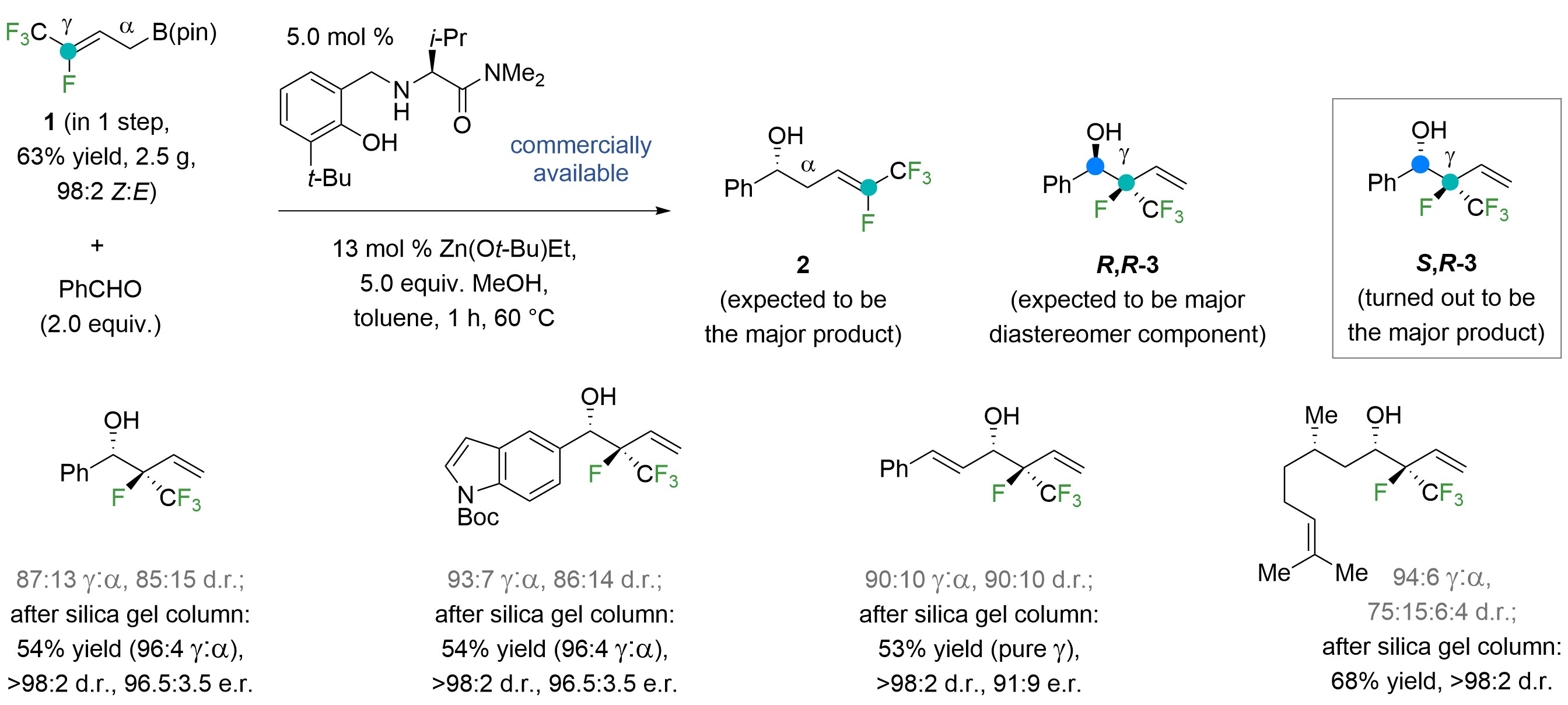 Figure 2. The catalytic method had two (auspicious) surprises: the addition is γ-selective and affords the diastereomer needed for applications to polyfluoro monosaccharides.