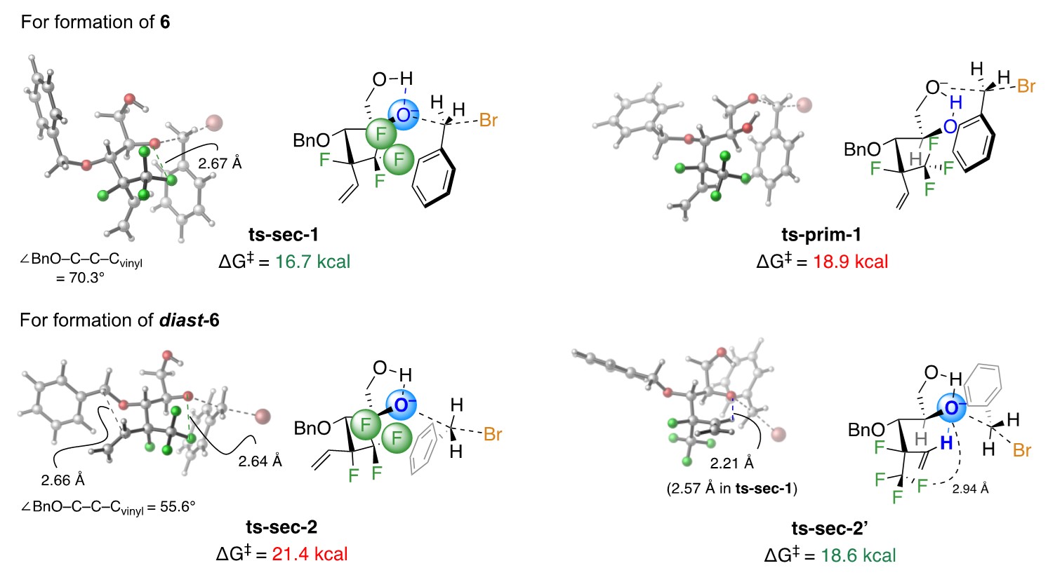 The uncommon preference for reaction at the more congested secondary alcohols also originates from the polyfluoro site. In ts-sec-1 (Fig. 5), electronic repulsion raises the latter’s nucleophilicity (higher ground state). For the other diol isomer, reaction preferentially via ts-sec-2’ is favored: the key interaction being H-bonding between the oxy-anion and the alkenyl H, rendered acidic by its fluorine neighbours (lower transition state). Here too, without having both a trifluoromethyl and a fluorine substituent, it is the primary alcohol that is preferentially protected.