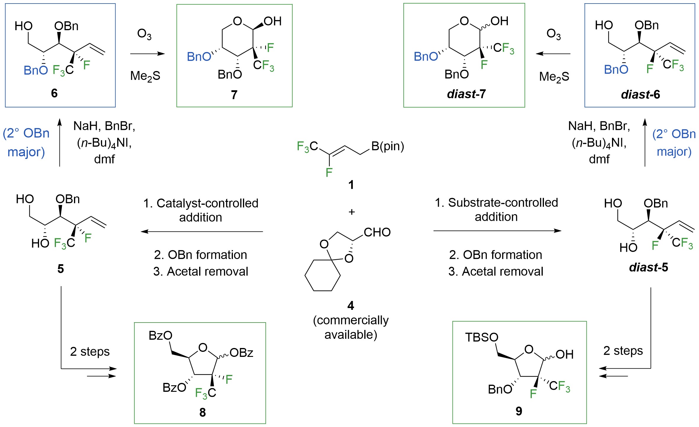 To see if the catalytic process can provide access to polyfluoro furanoses and hexoses (Fig. 3), we reacted 1 with aldehyde 4, prepared the benzyl ether, and removed the acetal, obtaining 5. Hardly expecting another shocker, we took what we thought would be the first step in a graceless protection/deprotection sequence leading to differentially protected 6, which would then be converted to pyran 7. However, it was 6 that was formed when 5 was subjected to NaH and BnBr (54% yield): the more hindered alcohol had indeed reacted preferentially. Analogously, reaction of diast-5, obtained from a substrate-controlled stereoselective process involving 1 and 415, afforded diast-6 as the major isomer (39% yield). We were happy to be able to access different polyfluoro heterocycles efficiently. In the meantime, though, another brain teaser had landed on our lap.