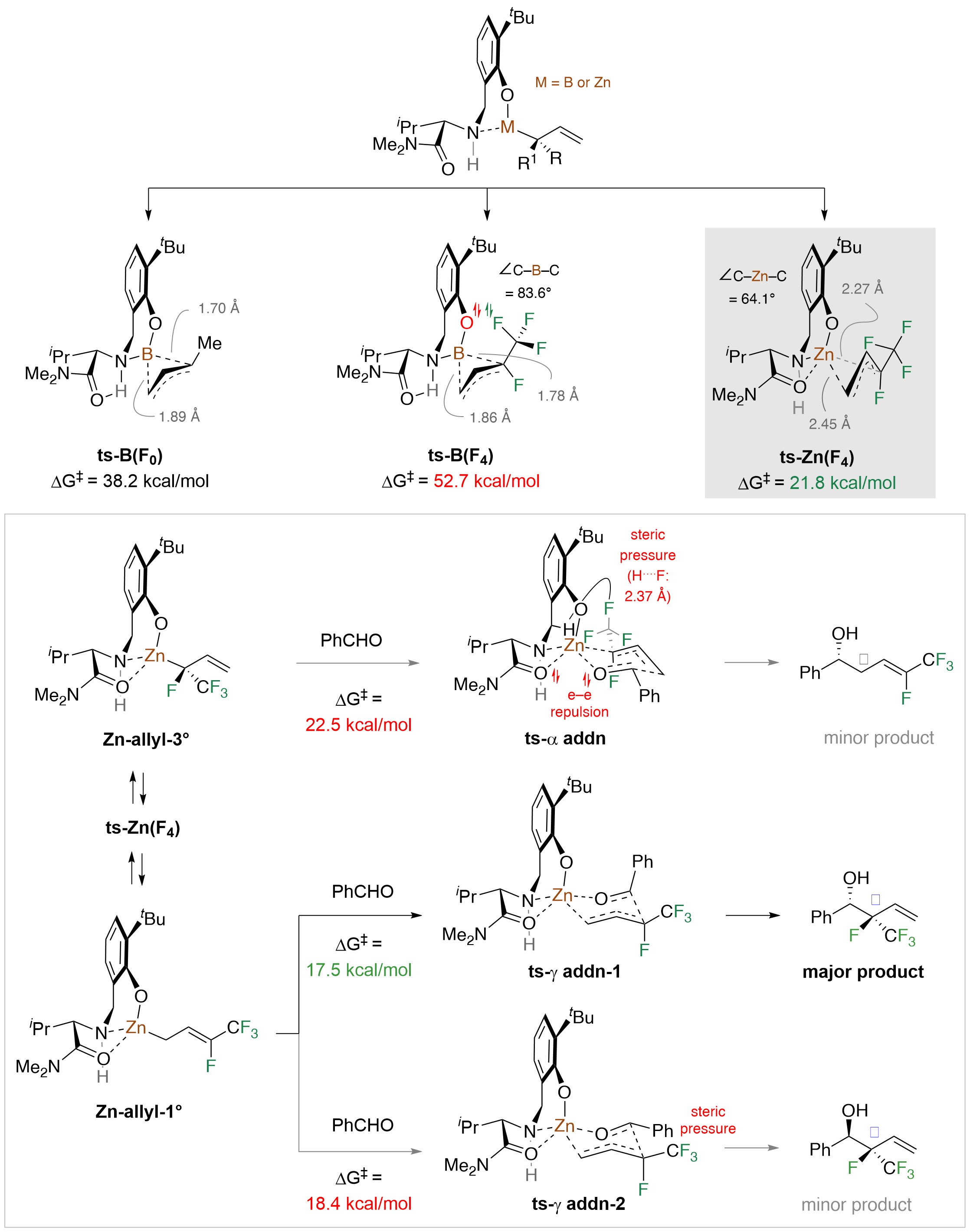 To clarify the mechanistic riddles, we carried out an assortment of experiments and benefitted from the computational expertise of Professor Liu and his team at Pittsburgh. Before long, it was evident that the catalyst is not an organoboron species, as we had supposed, but probably an organozinc compound (Fig. 4). The longer distances in a Zn complex alleviate steric and electronic repulsions and 1,3-shift transition state becomes easier, especially with fluorine atoms around. The initially formed Zn-allyl-3° can react directly with an aldehyde (via ts-α-addn; Fig. 4), giving the -addition isomer (initially expected), but the fluorine atoms probably destabilize ts-α-addn. This accelerates rearrangement to the less congested Zn-allyl-1°, and reaction via ts-γ-addn-1 becomes the ensuing favored option (vs. ts-γ-addn-2). Control experiments show that even with only the trifluoromethyl group present (i.e., H instead of F), the process reverts to being α-selective.