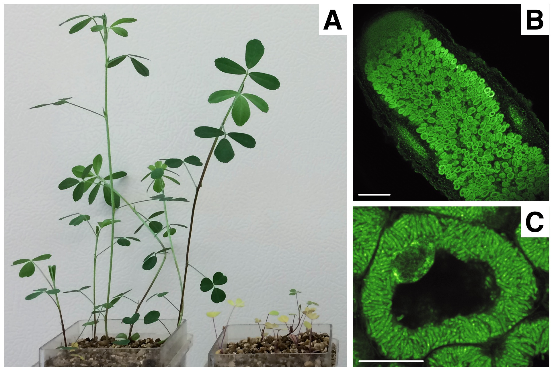 Figure 1. Rhizobium – legume symbioses. (A) This photo shows 28-day old alfalfa (Medicago sativa) plants grown in a vermiculite – sand mixture with a nutrient solution lacking nitrogen. The plants on the left were inoculated with Sinorhizobium meliloti, whereas the plants on the right were un-inoculated. The drastic difference in growth provides a nice visual depiction of the value of the symbiosis to the plant. (B,C) Confocal microscopy images of a cross-section of a white-blossom sweetclover (Melilotus alba) nodule containing N2-fixing S. meliloti. Cross-sections were stained with a DNA-binding dye. In B, the majority of the plan cells stain green due to them being filled with S. meliloti cells. In addition, the tip of the nodule (top left corner) is noticeably different than most of the nodule as it represents a different developmental zone of the nodule. In C, a close-up image of a single plant cell is shown to demonstrate just how full the plant cytosol is with S. meliloti. The green, elongated shapes are individual S. meliloti cells. The scale bars for B and C are 250 µm and 25 µm, respectively.