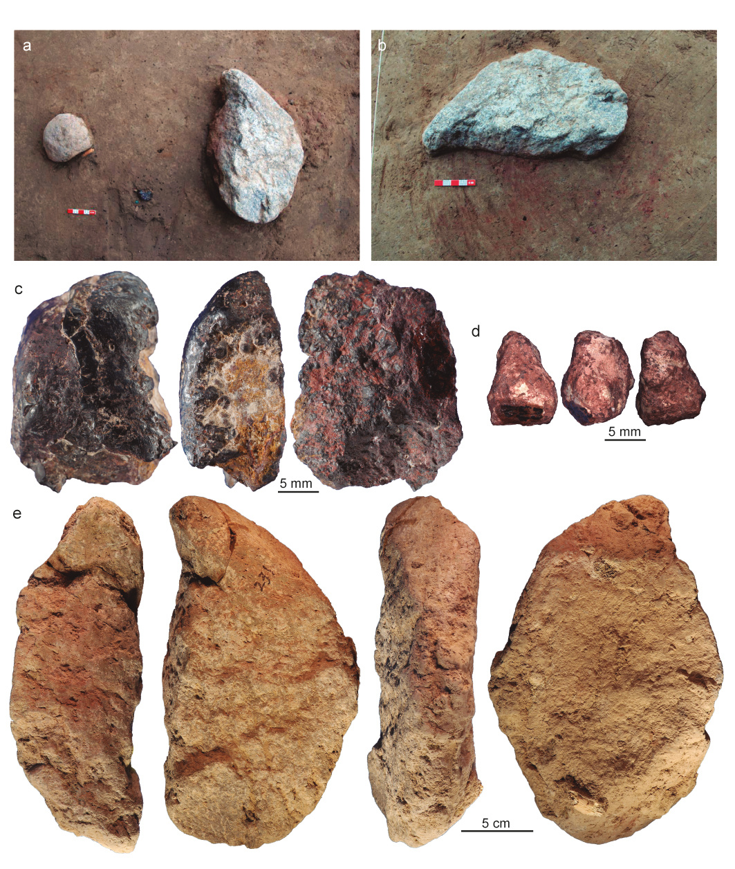 Artefacts laying on the red stained sediment patch. A, Quartzite cobble, limestone slab and ochre piece identified during the excavation. B, limestone slab laying on an intense red stained sediment patch. C, Ochre piece modified by grinding. D, Ochre fragment probably resulting from crushing a larger ochre piece. E, limestone slab showing ochre staining.