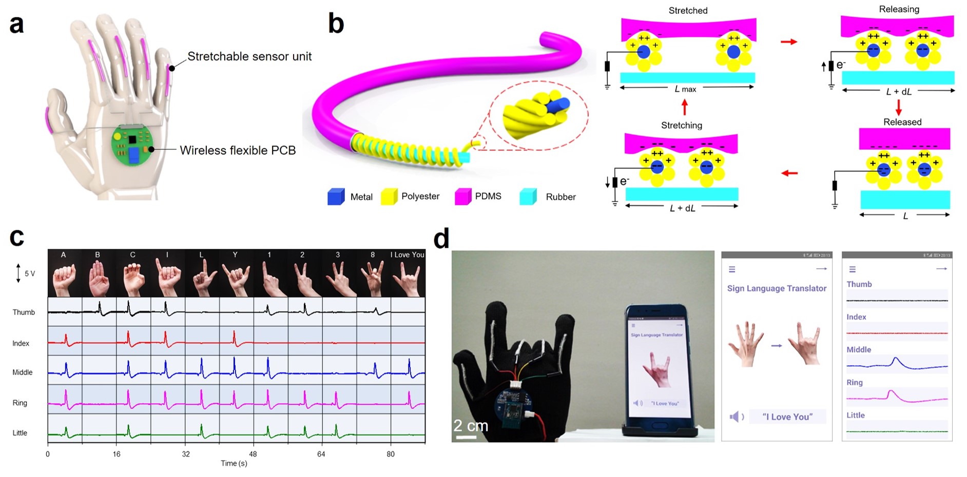 In our recent work published in Nature Electronics, highlighted by Science, we show that a wearable sign-to-speech translation system, assisted by machine learning, can accurately translate the hand gestures of American Sign Language into speech. The wearable sign-to-speech translation system consists of yarn based stretchable sensor arrays (YSSA) and a wireless printed circuit board (PCB). Due to its unique structural design and use of soft materials, the yarn based stretchable sensor array can conform to the skin of a human finger under both releasing and stretching states. Analogue triboelectrification and electrostatic induction-based signals generated by sign language components — including hand configurations and motions, and facial expressions-are converted to the digital domain by the wearable sign-to-speech translation system to implement sign-to-speech translation.