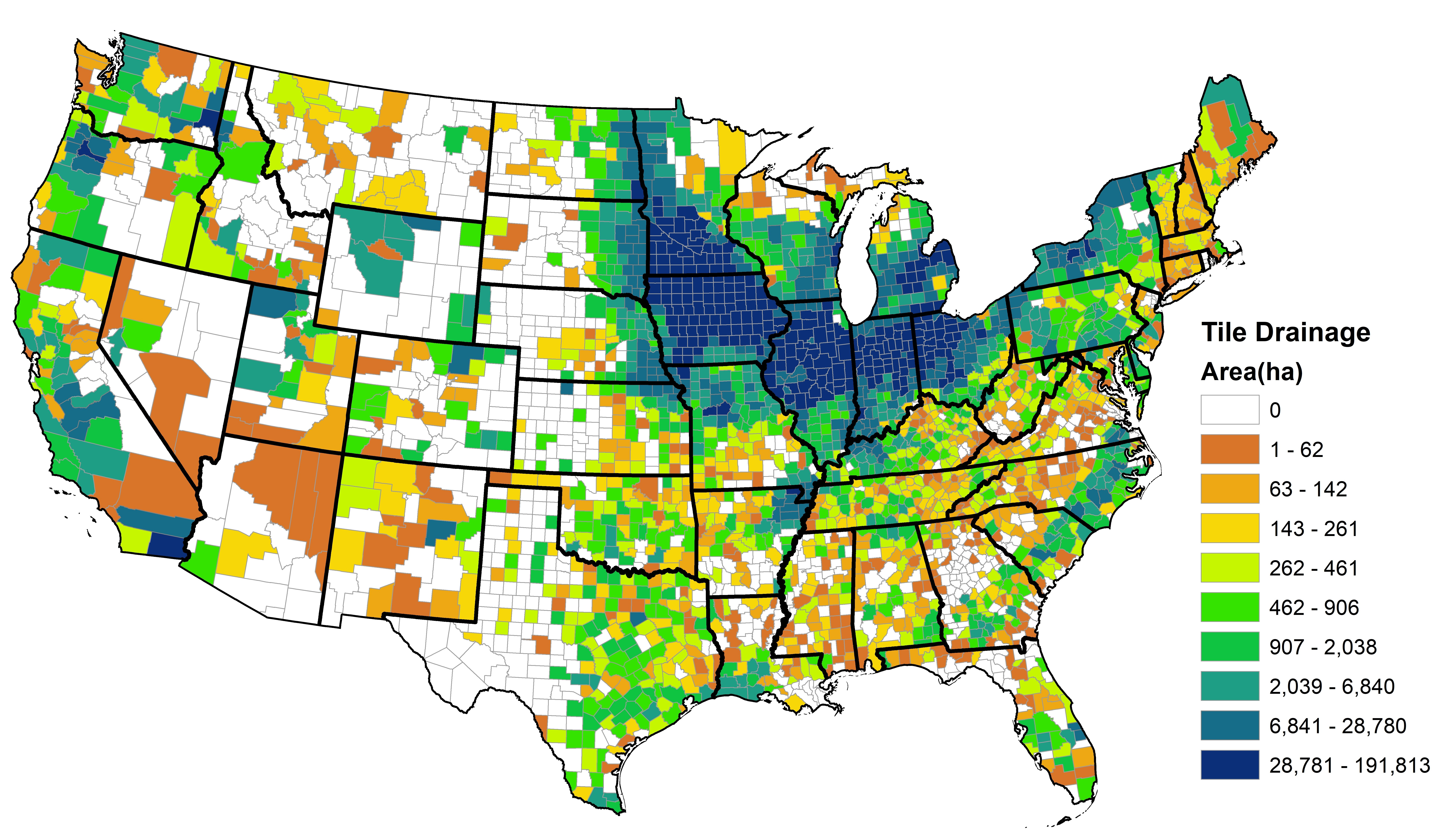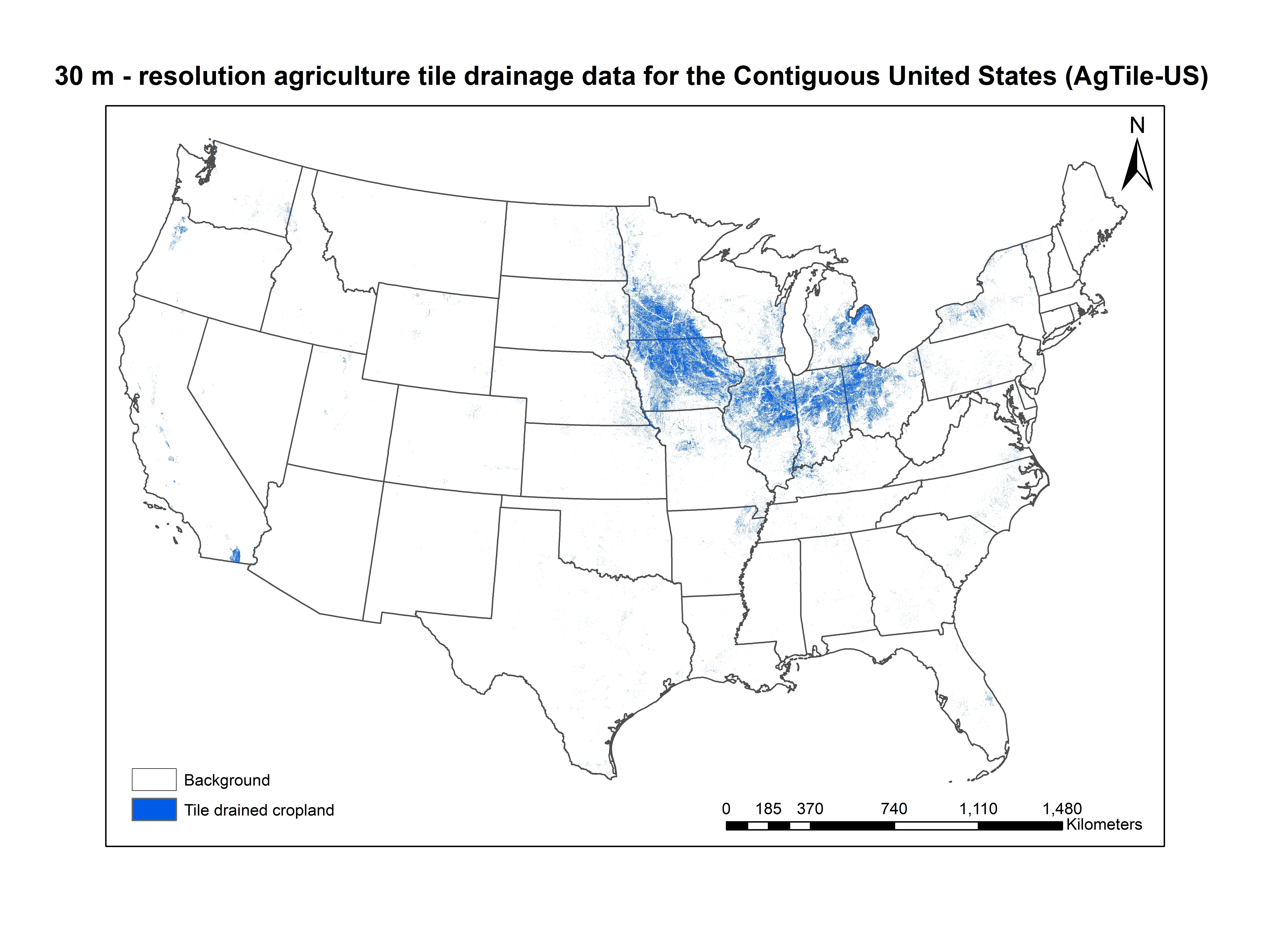 Subsurface tile drainage is one of the most widely-used agriculture management practices to enhance crop yield in regions with high water tables or poorly drained soils. Based on the U.S Department of Agriculture (USDA) National Agriculture Statistics Service (NASS) 2017 Census of Agriculture, the spatial extent of tile-drained croplands in the U.S. is around 22.48 million ha, out of which 18.79 million ha (83.8%) are mainly in six Midwestern states. Correctly modeling the tile-drainage impacts on the hydrologic cycle is a daunting challenge due to the lack of continental-scale high-resolution tile-drainage data, because farm-, field-, and sub-county-scale information on tile drainage are not available.