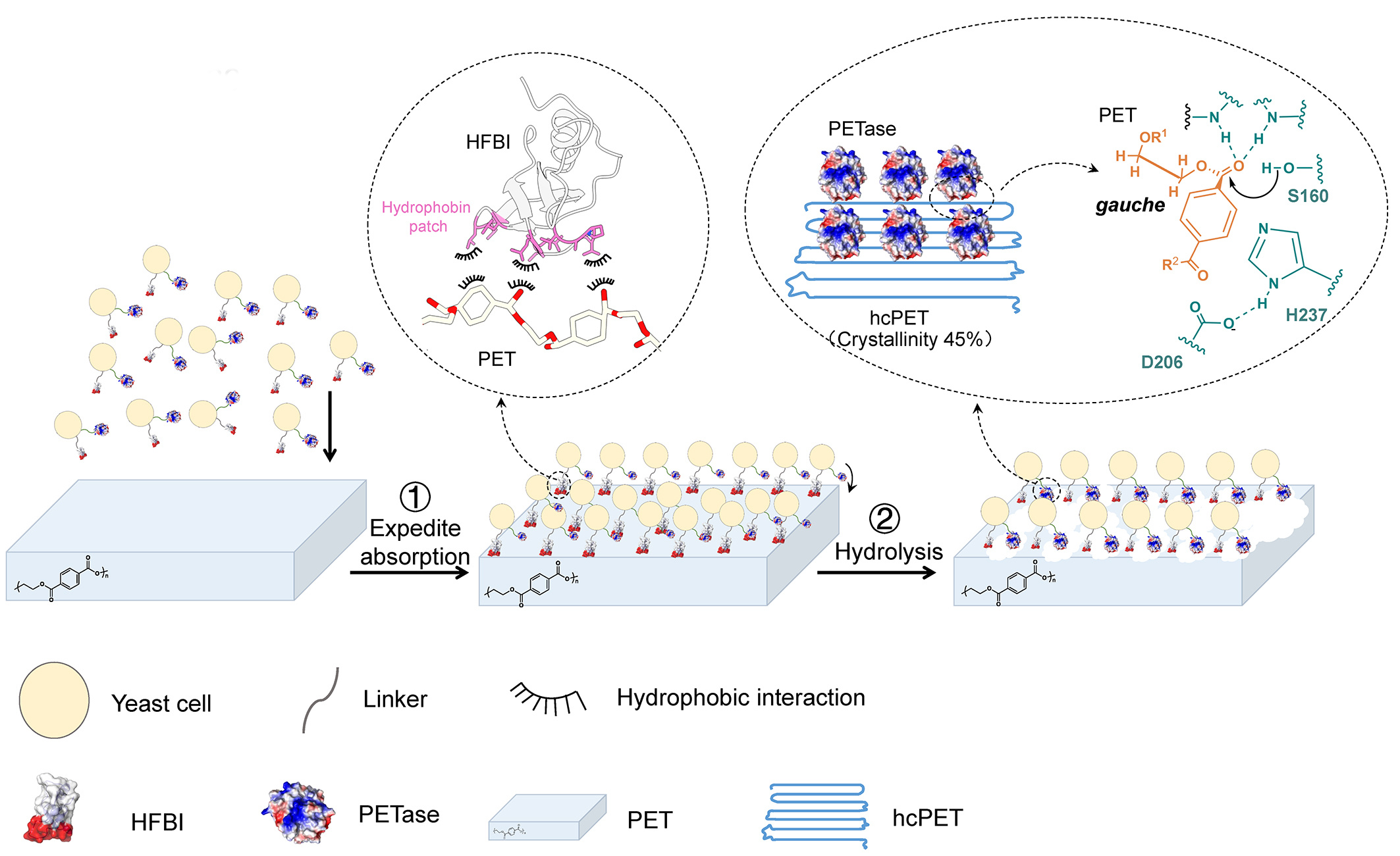 Figure. 2 Schematic diagram of hydrolysis of hcPET by codisplay systerm. Firstly, due to the presence of HFBI, codisplayed cells quickly adsorbed to the hcPET surface, and the adsorption rate on the hcPET surface was close to 100%. Secondly, PETase contacts the surface of high crystallinity PET, and then hydrolyzes the PET chains, thus achieving the effect of efficient hydrolysis of high crystallinity PET. Different figures are used in the illustration to represent different elements.