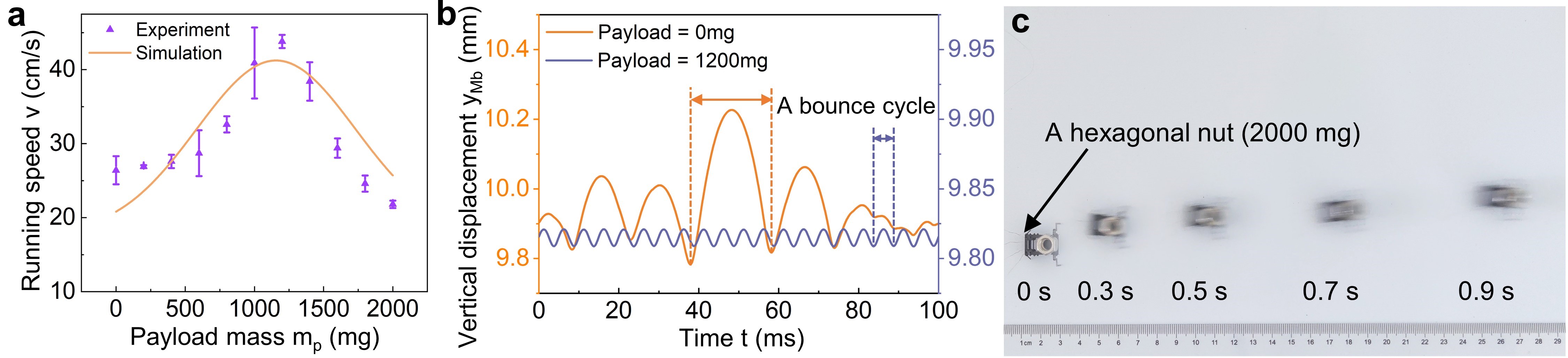 The high untethered mobility of the BHMbot is attributed to the complementary combination of bouncing length and high bouncing frequency after carrying payloads. Differing from the existing microrobots, both experiments and simulation results indicate that the running speed of the tethered BHMbot versus payload mass increases firstly and then declines, and the mass corresponding to the maximum speed is defined as mop. The inner mechanism resulting in the variation tendency is revealed based on experiments and dynamic simulations. The initial increase of the running speed is attributed to the dominant increase in bounce frequency when the payload mass increases from zero to mop. However, when the payload mass continues to grow, the increase of bounce frequency is unable to counter the decrease of bounce length, which leads to a decrease of the running speed. Benefiting from the characteristic, the optimized BHMbot demonstrate the maximum running speed of 25 BL/s after carrying a payload of 2.0 g (5.5 times its own weight).