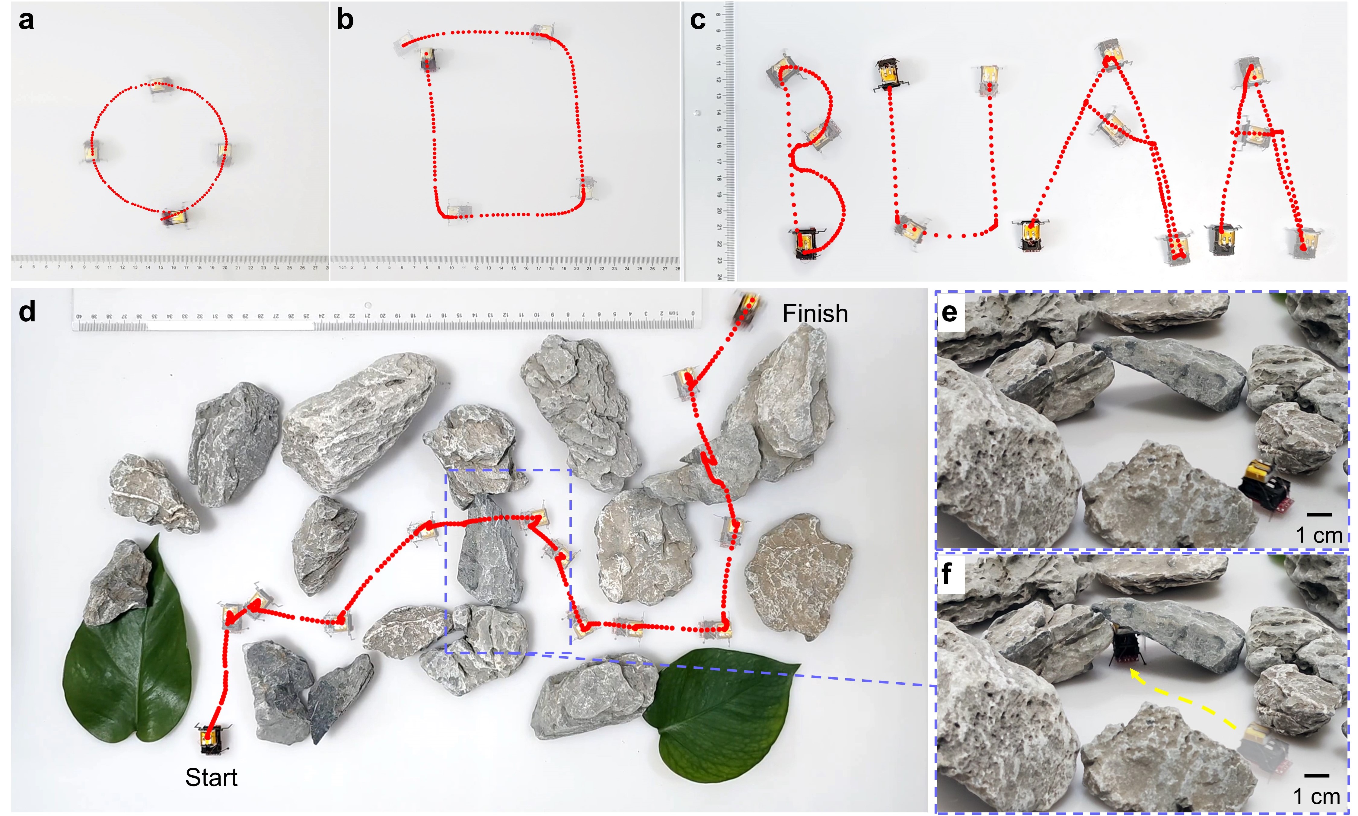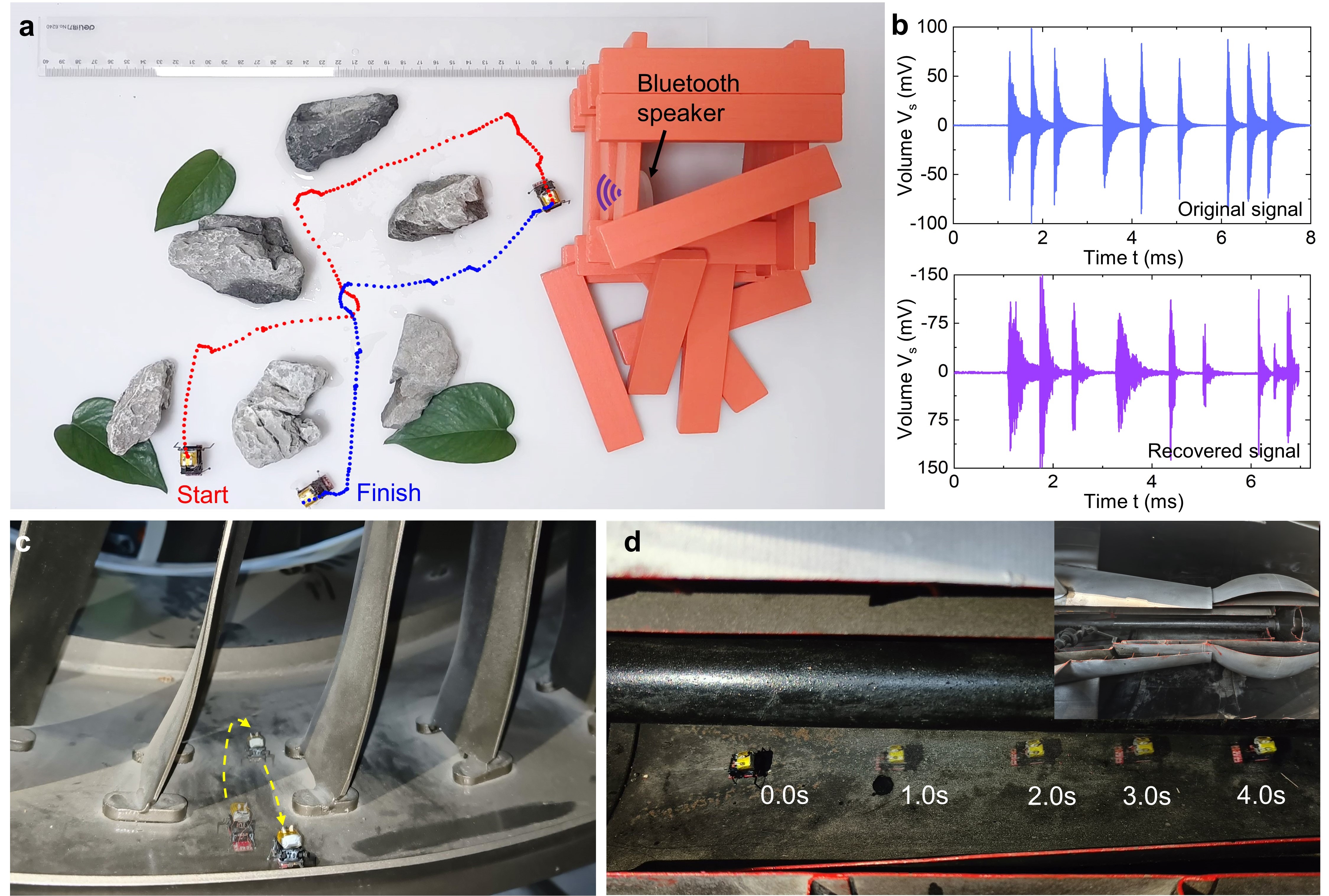 Aided by the mini size and high mobility, the BHMbot can go through narrow spaces and reach specified locations to execute special tasks. Via a commercial MEMS microphone (60 mg), the BHMbot successfully collect SOS sound signals of a Bluetooth speaker buried by building blocks. The sound data is then transmitted to a computer and converted to real sound. The BHMbot can also goes through the narrow passage between two stator blades of a civil turbofan engine and the tailbone of a turbojet engine. Benefiting from the development of micro cameras at millimeter scale, it is promising for the BHMbot to integrate with a micro camera to capture internal images of aero engines in the future.