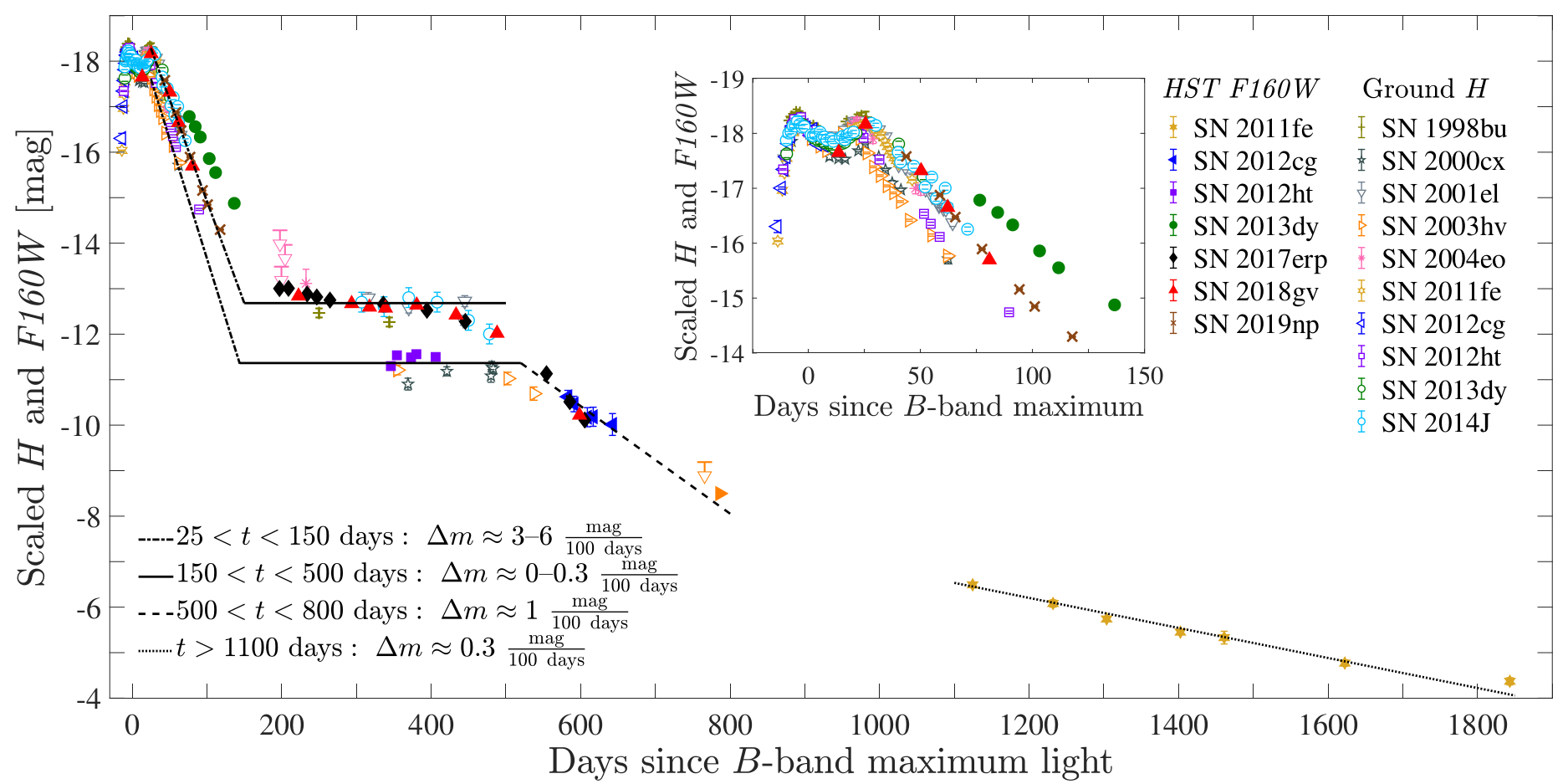 It did not. Instead of declining in brightness, the light curve stayed pretty flat for nearly 300 days. I collected four more SNe Ia from Adam’s various HST programs (Figure 1). One of them - SN 2018gv, observed at similar phases as SN 2017erp - showed the same F160W plateau.