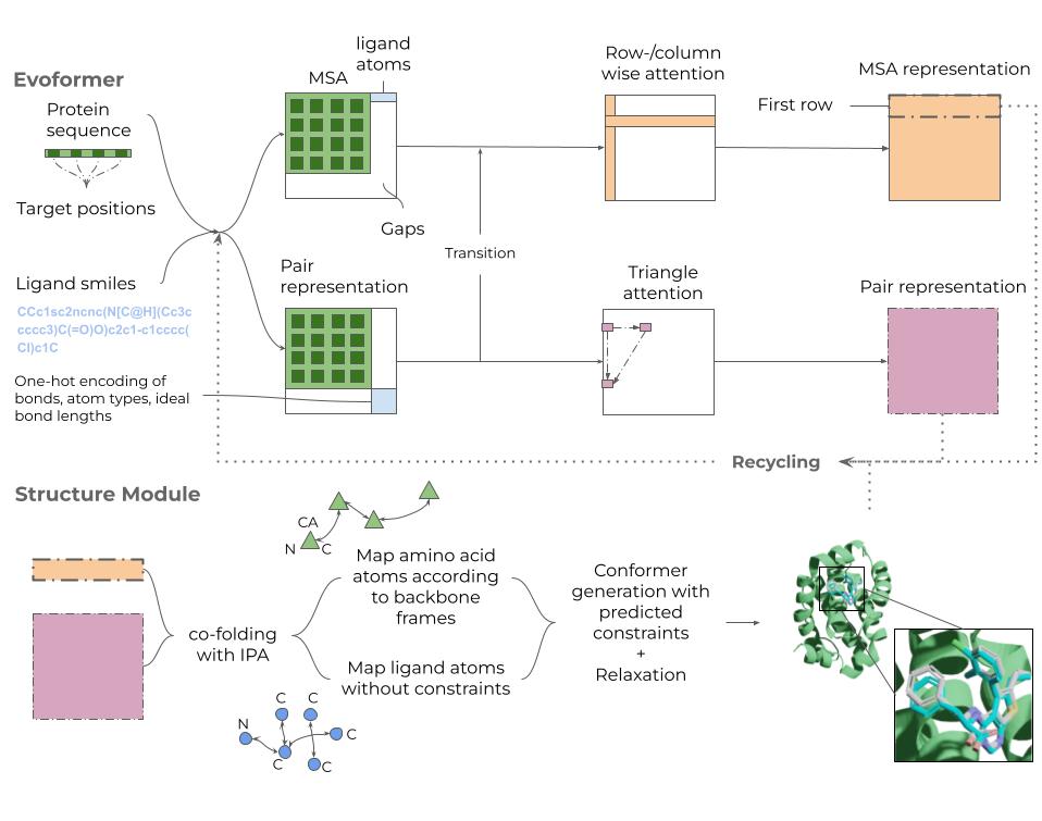 Umol uses a modified EvoFormer module from AlphaFold2 [2], which processes protein sequence information in two tracks. First, a multiple sequence alignment (MSA) of the protein sequence, appended with ligand atoms, is constructed with a row- and column-wise self-attention. The MSA allows for identification of co-evolving residues and motifs and this information is passed to the pairwise representation track. Second, the pair representation track processes pairwise interactions both within the protein and between protein and ligand atoms using a triangle attention update mechanism. The ligand atoms are augmented to the pairwise representation of the protein using features like bonds and atom types.
