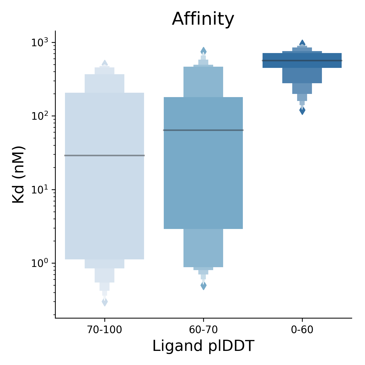 Protein-ligand affinity is an important measure of a drug molecule’s effectiveness in binding to its intended target. Using the predicted confidence from Umol, the plDDT, it is possible to distinguish high- and low-affinity binders. At ligand plDDT above 70, the median affinity is 30 nM, while below 60 plDDT, the median affinity is 500 nM. In addition, the plDDT is an effective estimate of the accuracy of the predicted complex.