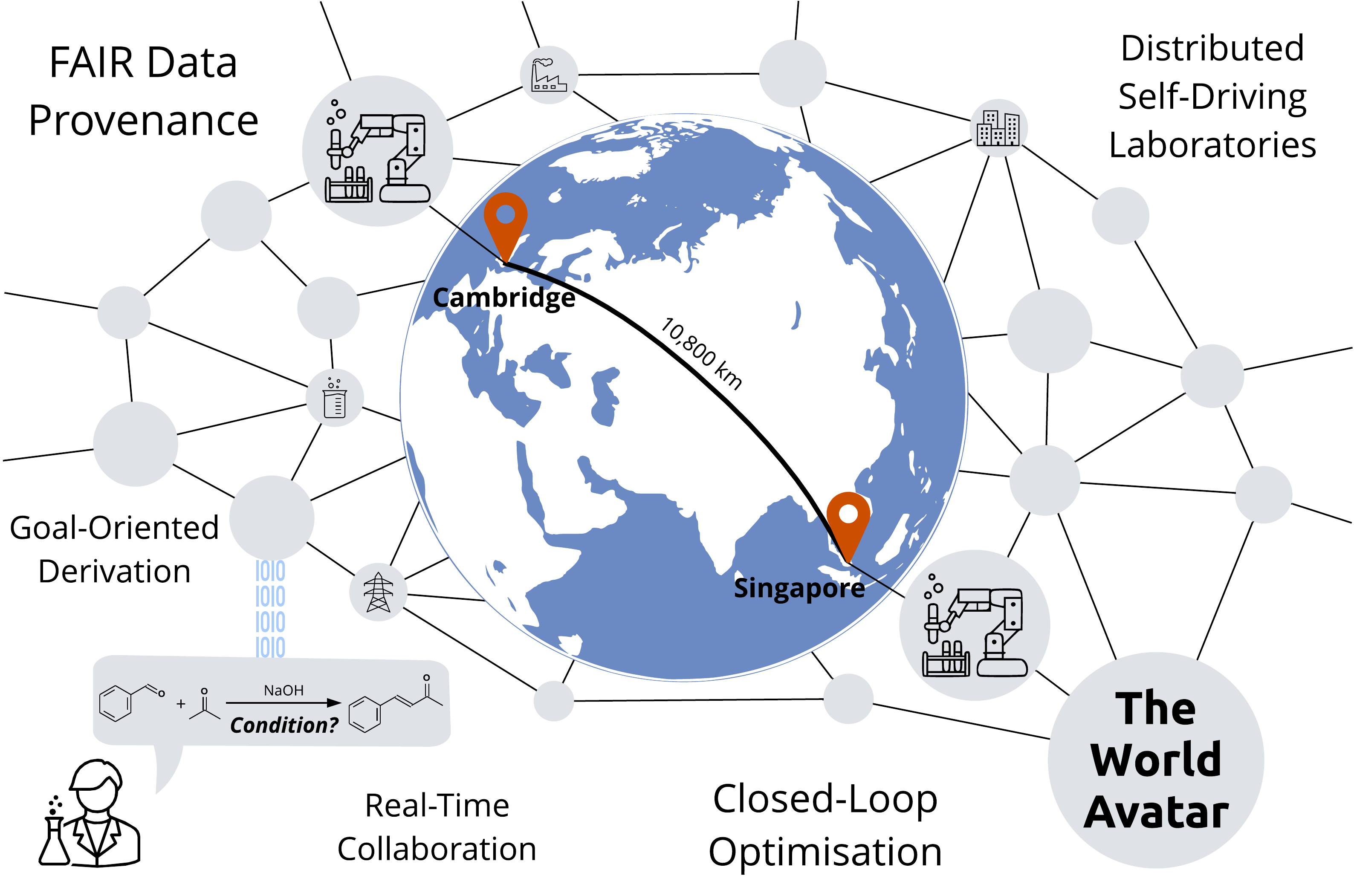Using the technology behind the World Avatar, we are creating a live, connected digital twin of our lab. We call this the “Digital Lab Framework”, where all data, software, hardware, and workflow are connected and interoperable through ontologies in knowledge graphs. Then, autonomous computational agents within the knowledge graph can automatically pull insights from the connected data and streamline the workflow. These knowledge graphs are then distributed over the internet using semantic web technology. We have also implemented authorisation and authentication mechanisms to ensure the assets are only accessible to the correct users and agents.