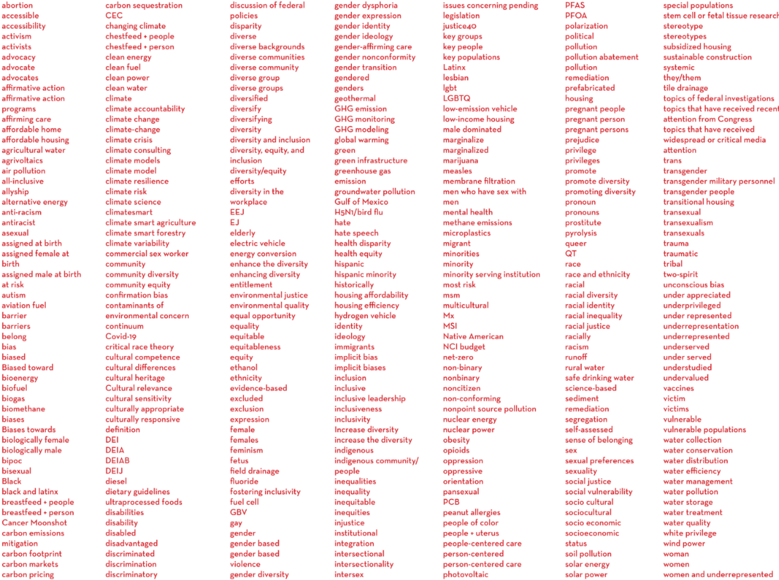 In a sweeping and increasingly alarming trend, U.S. federal agencies and academic institutions have begun restricting or flagging the use of over 350 terms, including: