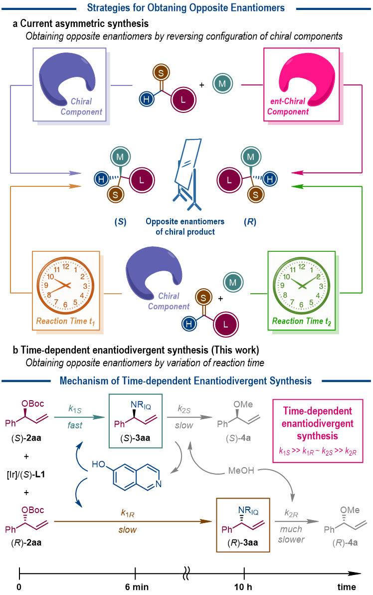 Comprehensive mechanistic studies reveal that the reason behind this unique time-dependent enantiodivergent synthesis phenomenon is that the same chiral Ir-catalyst promotes sequential kinetic resolution of allylic precursors and amination products with amine nucleophiles and the solvent methanol as the reaction partner, respectively. The appropriate permutation of the four individual reaction rates (those of two enantiomers of the allylic precursors and two enantiomers of the allylic amination products) guarantees the isolation of each enantiomer of the allylic amination products in a highly enantioenriched form at different reaction time.