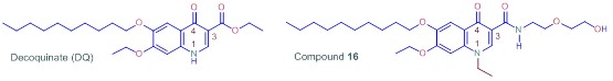 DQ, with trade name Deccox, is most conveniently applied as an additive to poultry feed. When DQ is incorporated at 0.6% by weight into the feed, approximately 20-40 mg of DQ per kg of the feed consumed is delivered. DQ appears to have a benign toxicity profile – it is unlikely to be a carcinogen either by genotoxic or non-genotoxic mechanisms (ref. 1). Interestingly, it was noted that "most strains of bacteria appear resistant to the effects of decoquinate at concentrations of >64 mg/L, substantially higher than the concentration of decoquinate expected in the digestive tract" and "consequently, any effects on the bacterial flora of chickens is likely to be minimal……it is also very unlikely that the use of decoquinate would result in cross resistances with clinically important antimicrobial compounds" (ref. 1). The importance of these comments in relation to evolution of antibiotic resistance aside, the evident lack of antibiotic activity of DQ is indeed significant in the context of activity of our N-alkyl amide derivatives - the best compound (compound 16) has an MIC90 of 1.25 μM or 0.522 mg/L against the TB bacterium Mycobacterium tuberculosis (Mtb); indeed as far as we are aware, DQ itself has not been screened against Mtb. The reason why our DQ derivatives were screened against Mtb was because current second line treatment of TB actually utilizes fluoroquinolones ciprofloxacin, gatifloxacin and others that incorporate the quinolone scaffold of DQ, albeit decorated with rather different substituents.