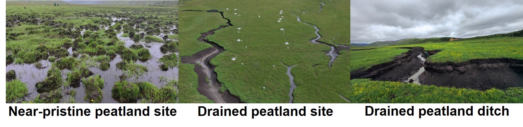 In situ experimental sites in the growing season 2023 from the Zoige alpine peatland, China. From left to right are near-pristine peatland, drained peatland (for livestock grazing), and peatland ditch (photo by Dezhao Gan).