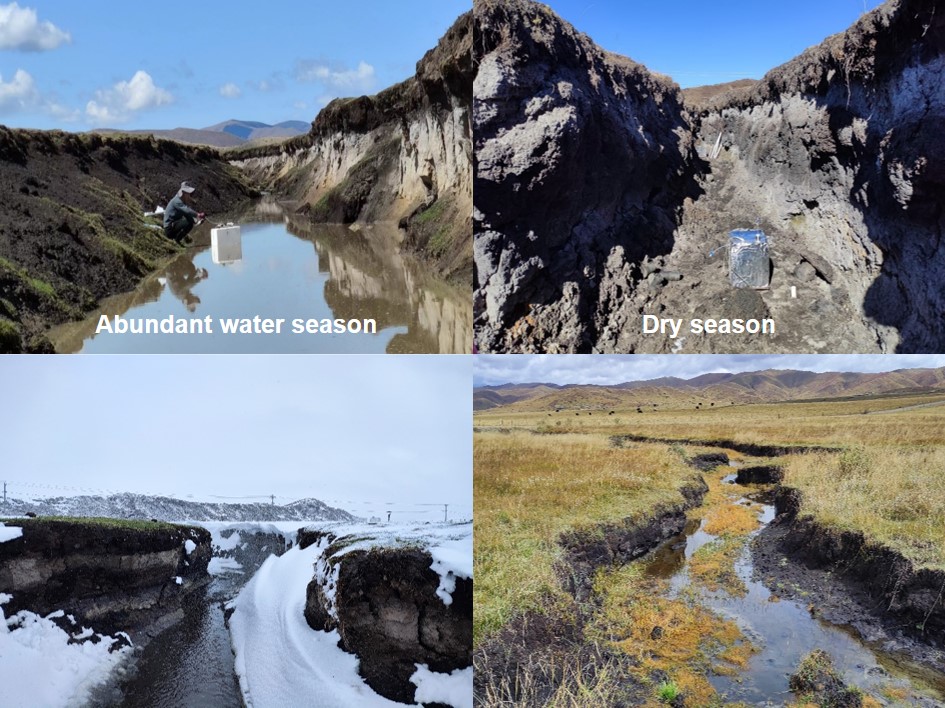 The ditch in different states in the drained peatlands (for livestock grazing) in 2023 from Zoige alpine peatland, China (photo by Dezhao Gan).