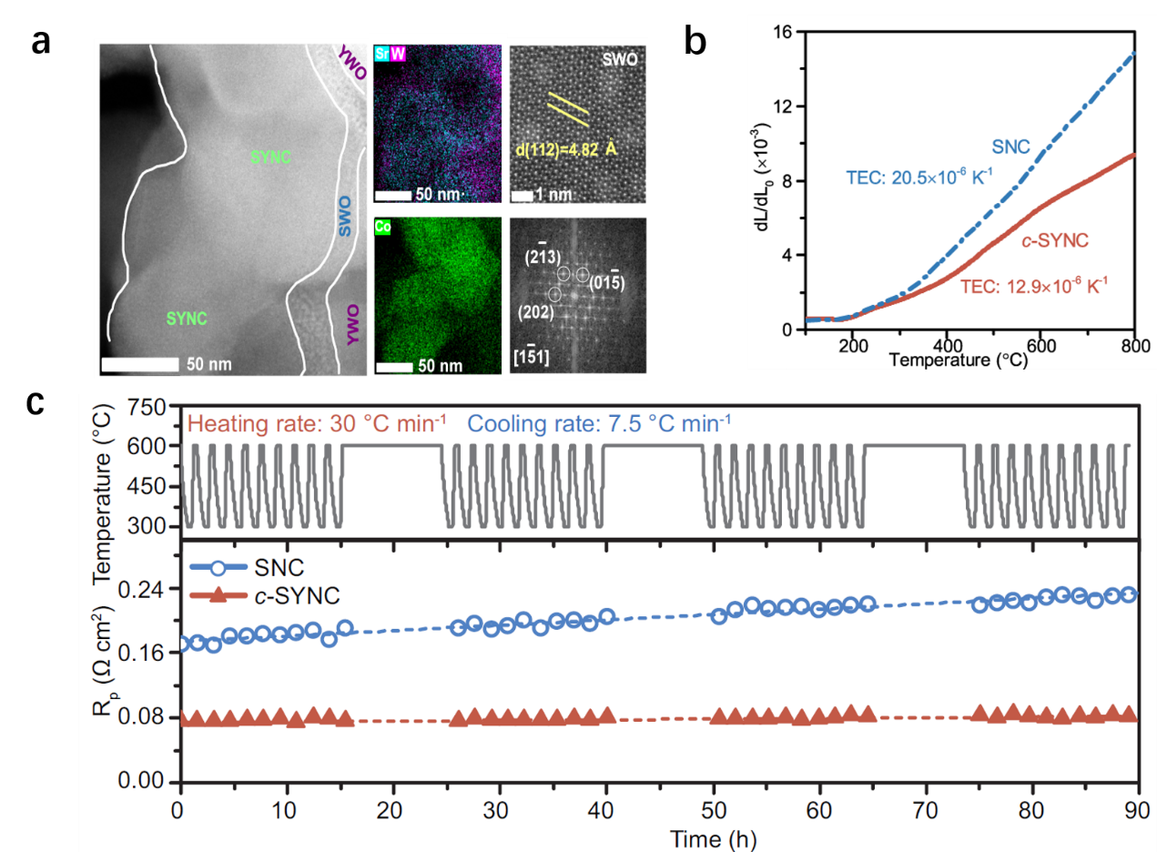 Fig. 1. a, STEM-HAADF of c-SYNC with each phase marked by dashed lines. Corresponding element mapping of Sr, W and Co for STEM and corresponding FFT images of the SWO phase. b, Thermal expansion curves from 100 to 800 °C in air of dense c-SYNC and SNC bar specimens. c, The ASR (Rp) response of SNC and c-SYNC based symmetric cell electrodes during 40 thermal cycles between 600 °C and 300 °C at a heating rate of 30 °C min–1 and passive cooling at ~7.5 °C min–1, 90 h total cumulative testing.