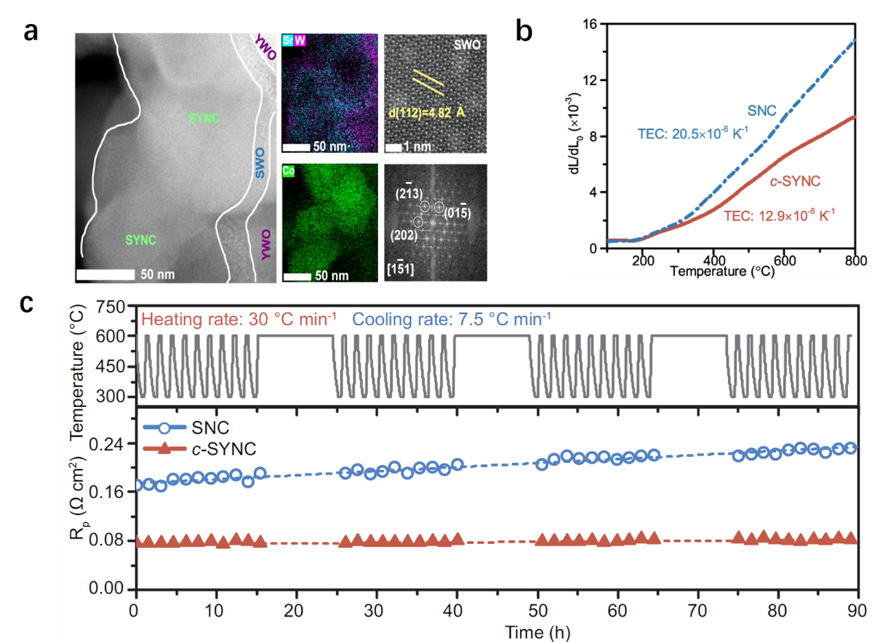 Fig. 1. a, STEM-HAADF of c-SYNC with each phase marked by dashed lines. Corresponding element mapping of Sr, W and Co for STEM and corresponding FFT images of the SWO phase. b, Thermal expansion curves from 100 to 800 °C in air of dense c-SYNC and SNC bar specimens. c, The ASR (Rp) response of SNC and c-SYNC based symmetric cell electrodes during 40 thermal cycles between 600 °C and 300 °C at a heating rate of 30 °C min–1 and passive cooling at ~7.5 °C min–1, 90 h total cumulative testing.