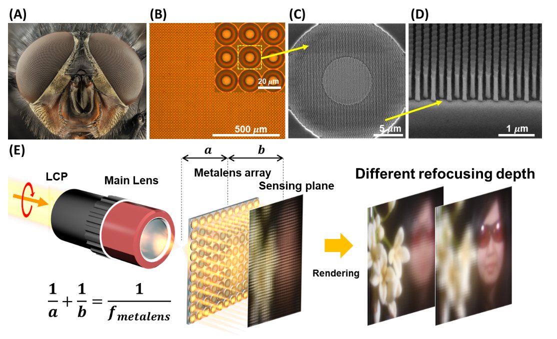 (E) Schematic diagram of light field imaging with achromatic metalens array and rendered images.