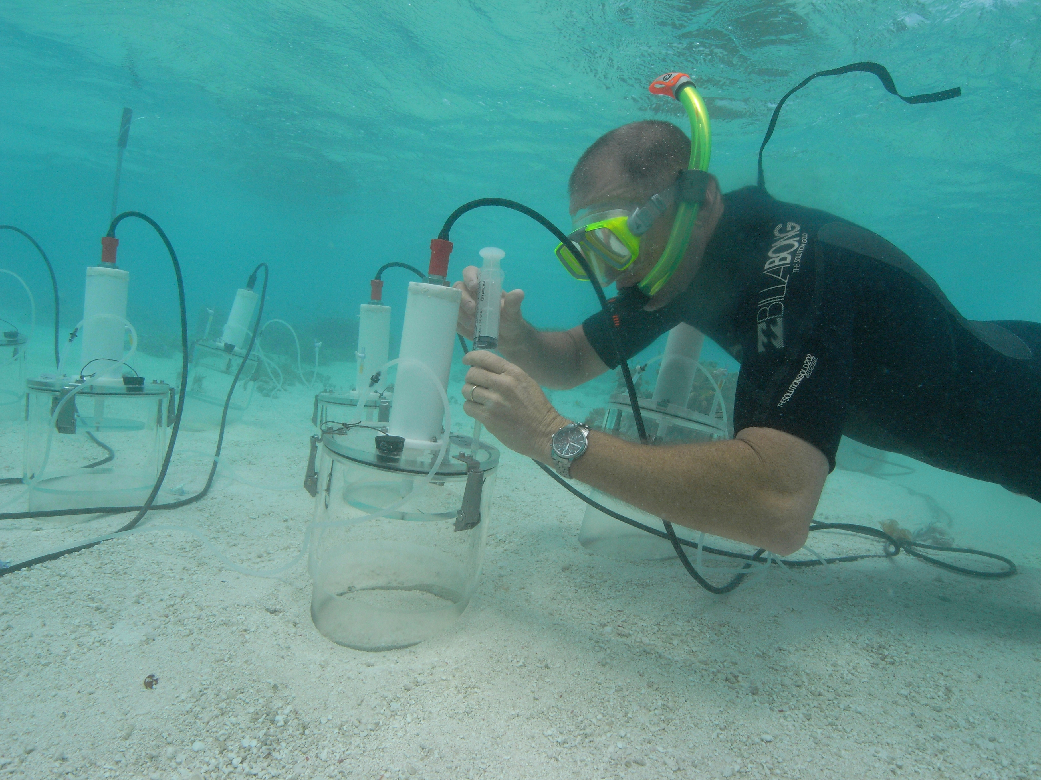 The dissolution measurements were made by placing benthic chambers underwater on coral reef sands. We showed that extrapolating the dissolution kinetics of CaCO3 phases from laboratory experiments to the in-situ dissolution of shallow coral reef CaCO3 sediments is complicated because light reaches the sediment surface, and the associated diel cycle of productivity and respiration is an important control on whether sediments are net calcifying/precipitating or net dissolving. We also demonstrated that pore water advection is an important control on the dissolution of permeable CaCO3 sediments as it transports O2 into the sediment matrix, stimulating aerobic respiration (Cyronak et al., 2013a).