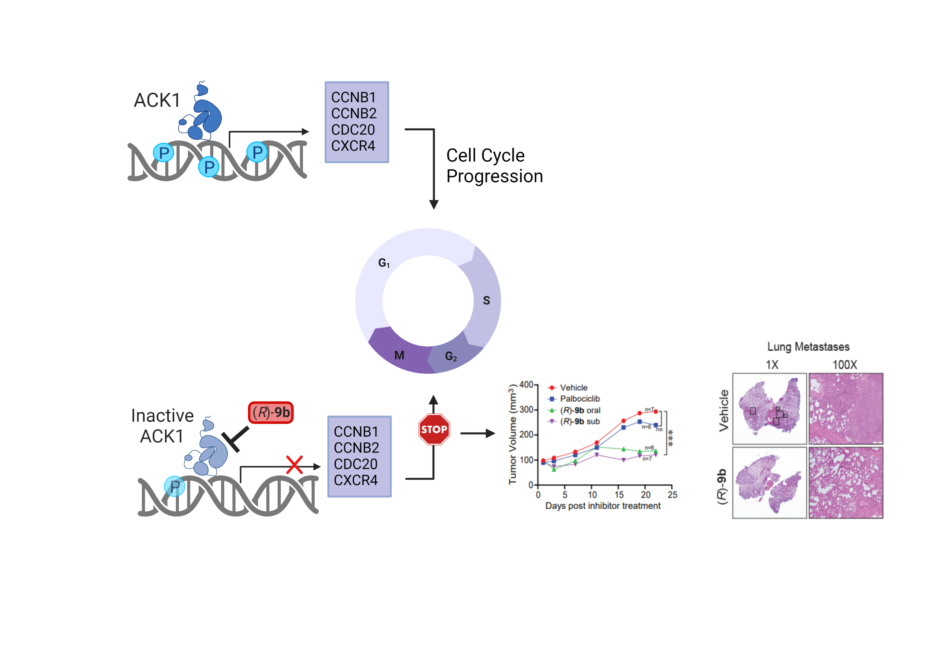 To our knowledge, this is the first report demonstrating the hyper-functioning of ACK1 kinase activity in breast cancer through epigenetic control of cell cycle regulating genes. Identification of (R)-9b as a novel small molecule inhibitor with excellent drug-like properties, eliminating off-target effects, opens up the potential of improving breast cancer therapy. Further validation of (R)-9b’s efficacy in clinical trials will improve treatment regimens, ensuring progression free survival in patients.