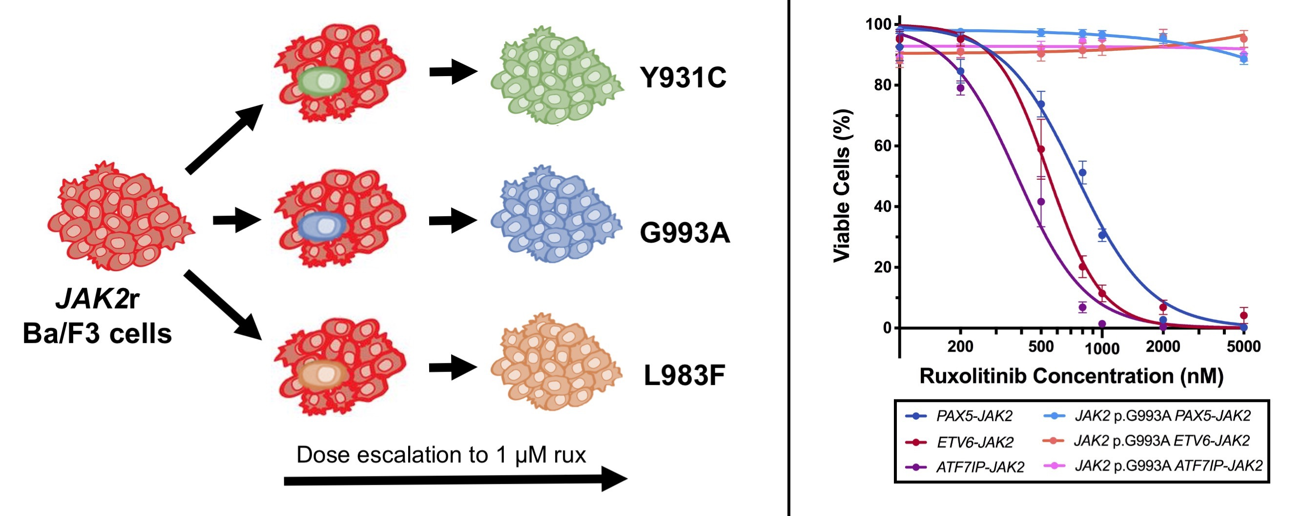 In this study, JAK2 fusion genes identified in ALL patient lymphoblasts by mRNA sequencing (mRNAseq) were expressed in a factor dependent murine pro-B cell line to model JAK2r ALL. We recapitulated acquired resistance to ruxolitinib in JAK2r ALL in vitro by treating three independent replicates of murine pro-B cells expressing a high-risk JAK2 fusion gene with gradually increasing concentrations of ruxolitinib. Sanger sequencing of RT-PCR amplified JAK2 fusion gene identified that each replicate had acquired a different mutation within the JAK2 ruxolitinib/ATP binding site. Two previously described mutations, JAK2 p.Y931C and p.L983F, were detected in addition to a previously unreported mutation, JAK2 p.G993A.