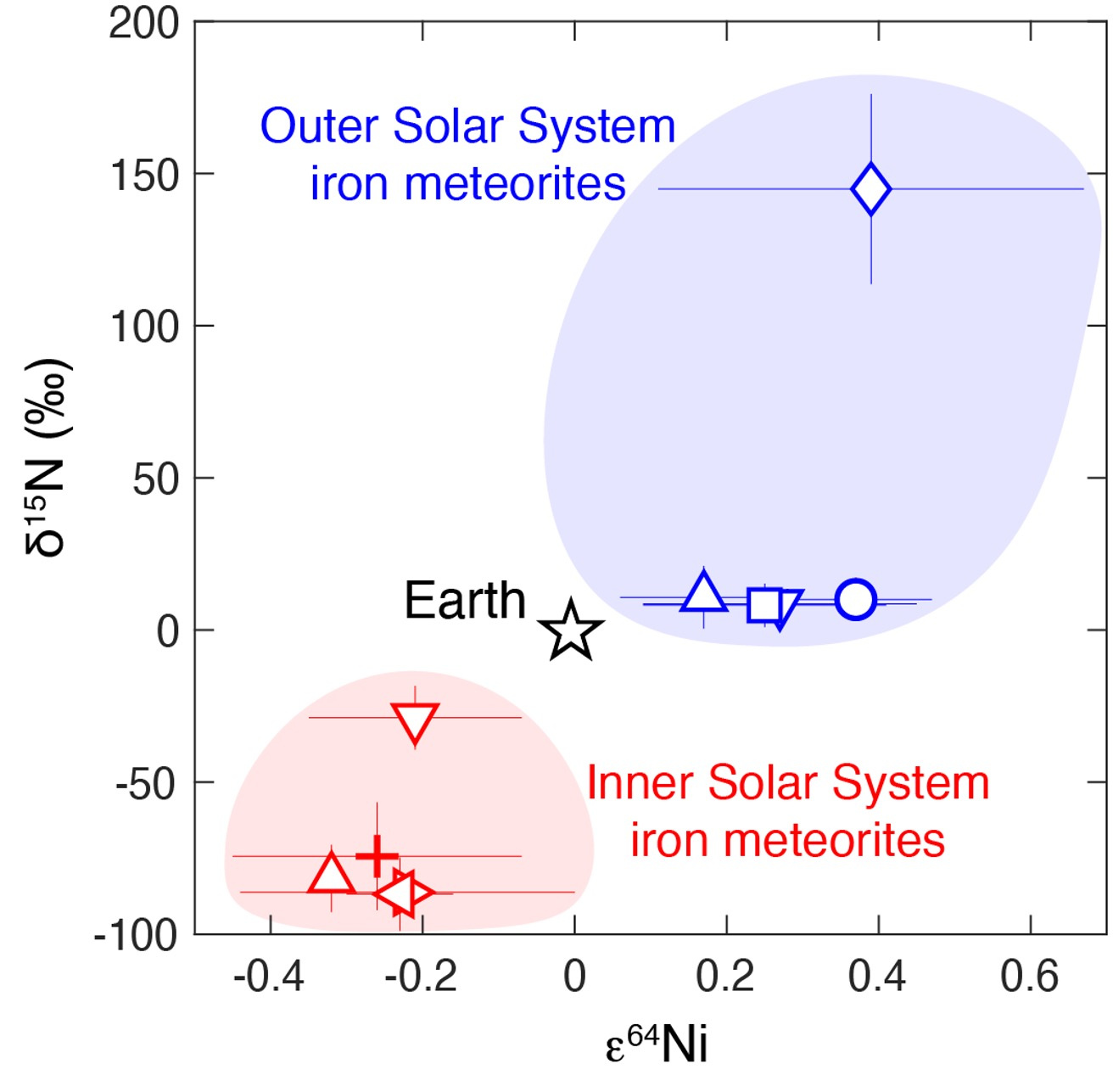 Fig. 1: The inner Solar System and outer Solar System meteorites contain distinctly clustered isotopic signatures of Nickel (a non-volatile element) and Nitrogen (a volatile element).