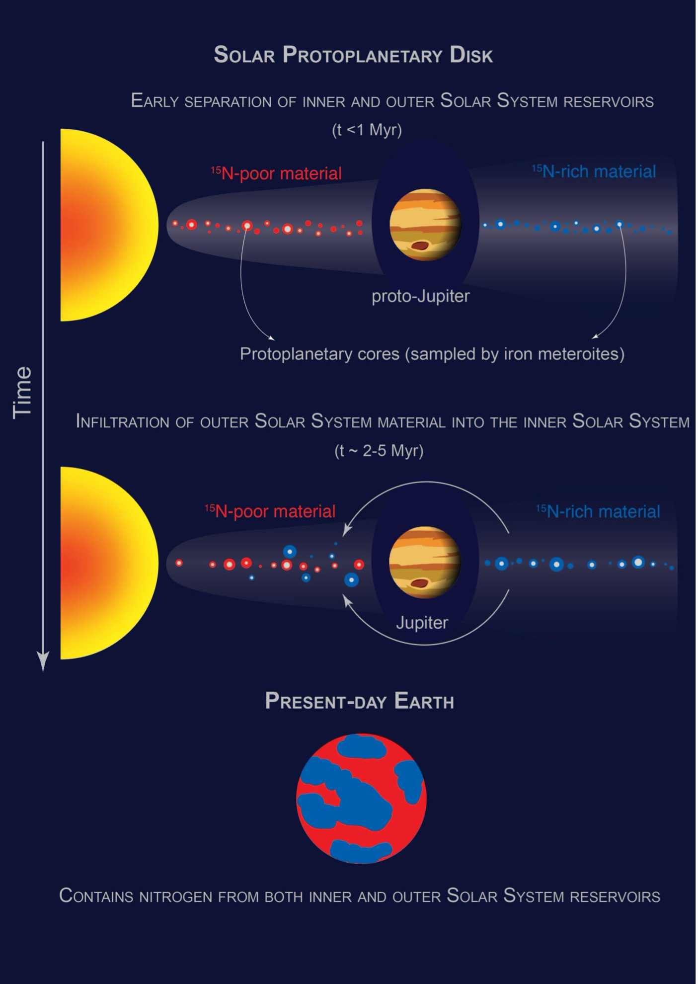 The primary implication of the results of this study is that nitrogen and potentially other life-essential volatiles like carbon and water were present in the inner disk dust, probably in the form of refractory organics, from the very beginning. This means that contrary to current understanding, the seeds of the present-day rocky planets – including Earth – were not volatile-free. We also show that the Earth’s present-day nitrogen isotopic inventory is from an almost equal contribution from the inner and outer regions of the disk. This can potentially alter our understanding on how life-essential elements might come together on distant exoplanets. Even if other protoplanetary disks don’t have any event resulting in the infiltration of volatile-rich materials from the outer zones, their inner rocky planets closer to the central star could still acquire volatiles from their neighboring zones.