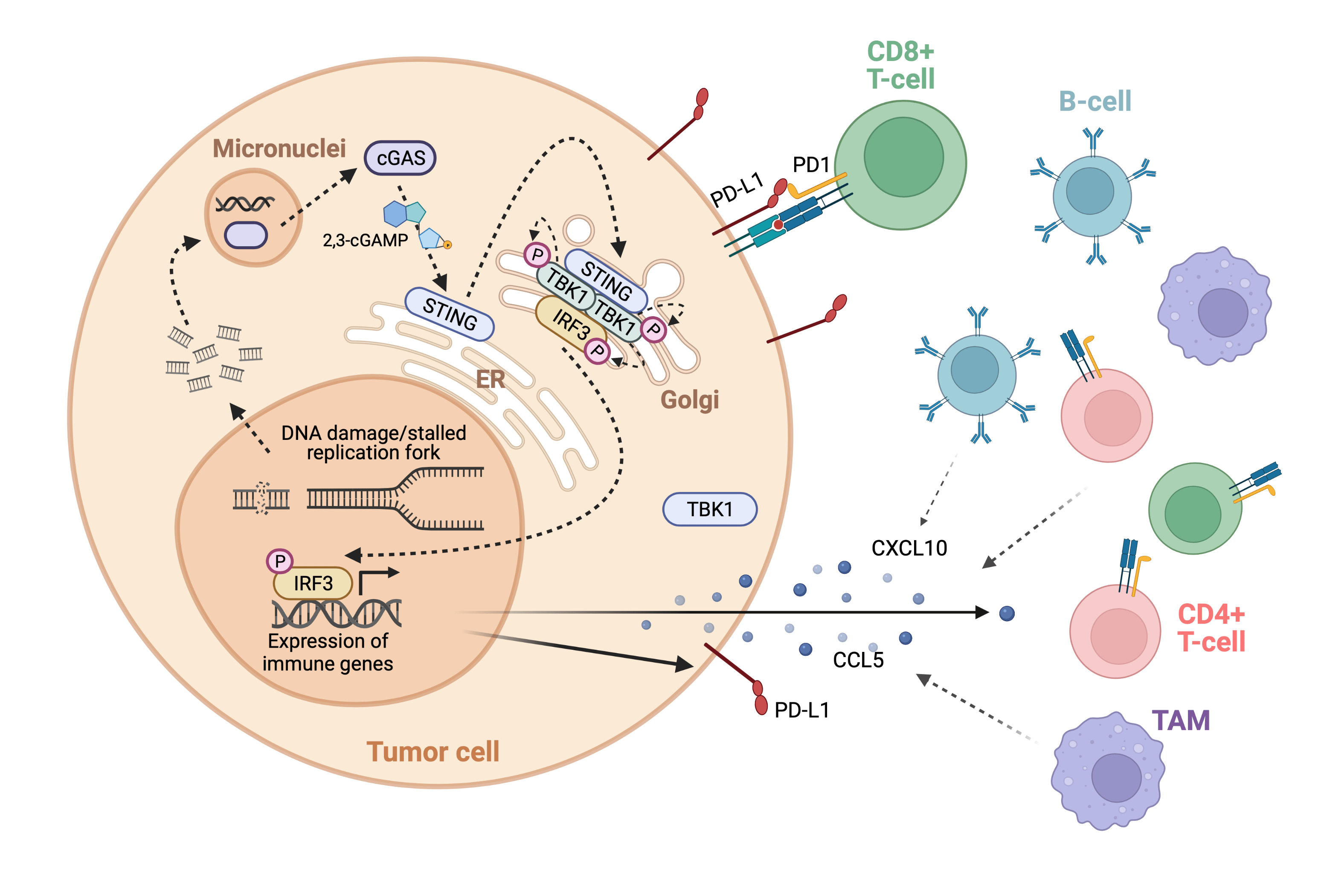 Figure 1: showing cytosolic DNA activating the cGAS-STING pathway, resulting in upregulation of IRF3 driving immune infiltration via cytokines (principally CXCL10 and CCL5), and increased expression of immune checkpoints including PD-L1.