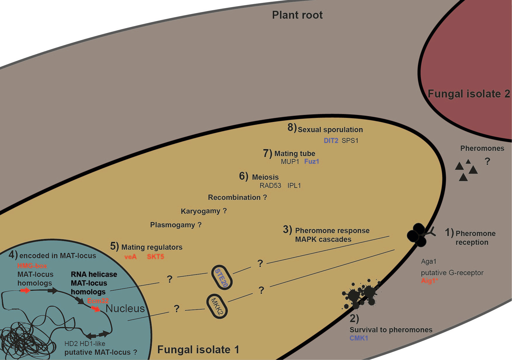 Although the previous findings were based on genome scans and revealed the presence of gene homologs related to sexual reproduction, we wanted to understand if there could be specifically expressed functionally active genes involved in mating and sexual reproduction when two genetically different isolates of the same species coexisted in plant roots.