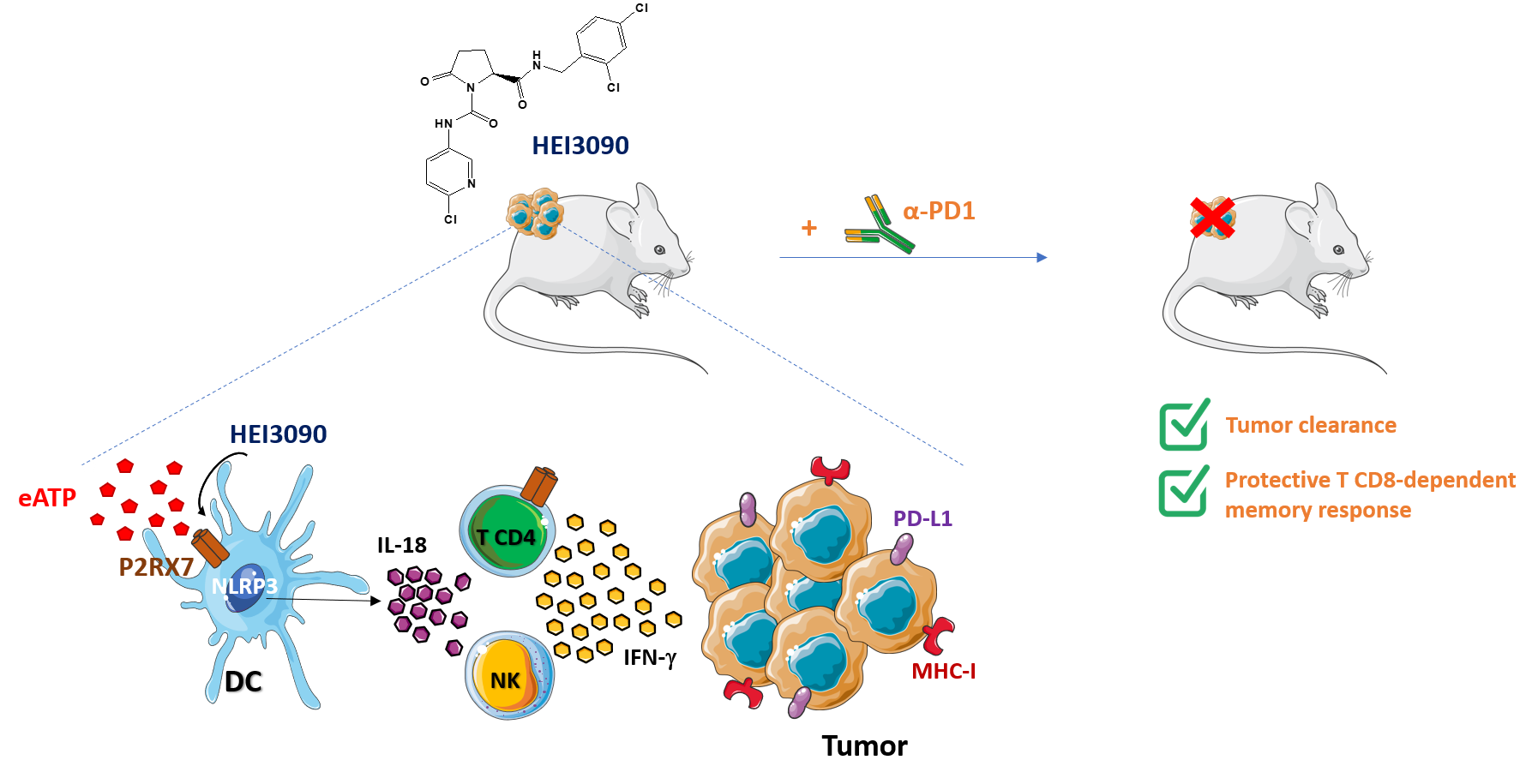In order to test the antitumoral proprieties of HEI3090, we used a transplantable syngeneic immunocompetent mouse model of lung tumor cells (LLC, Lewis Lung Carcinoma). We have shown that HEI3090 inhibits efficiently tumor growth and targets P2RX7’s expressing immune cells to trigger an antitumor immune response and enhance tumor immunogenicity. Therefore, combining HEI3090 with immune checkpoint inhibitors was a very interesting approach. Indeed, the combination of HEI3090 with αPD-1 cured 80% of mice transplanted with LLC cells and decreased tumor burden by 60% in an oncogene-induced mouse model of lung cancer (LSL KrasG12D). Cured mice were also protected against a tumor re challenge, highlighting the ability of HEI3090 to induce a robust immune memory response.