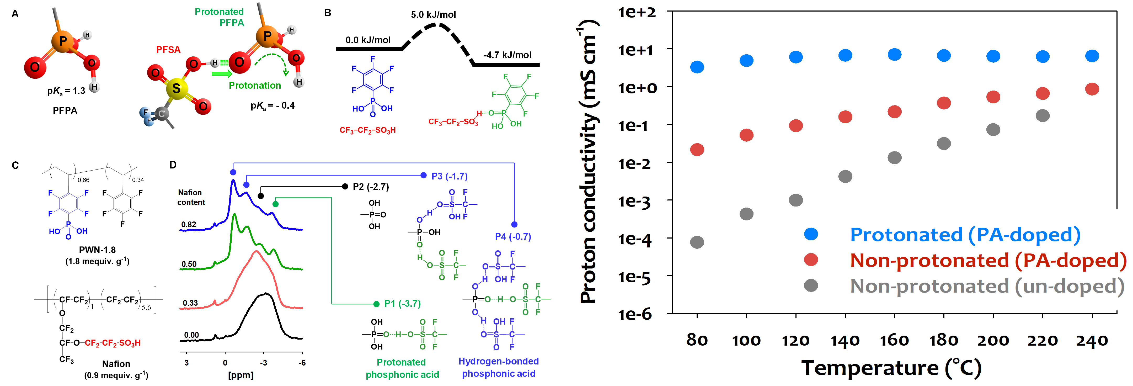 Figure 1. Protonation of poly(phosphonic acid) through blending with poly(perfluorosulfonic acid) ionomers and their properties