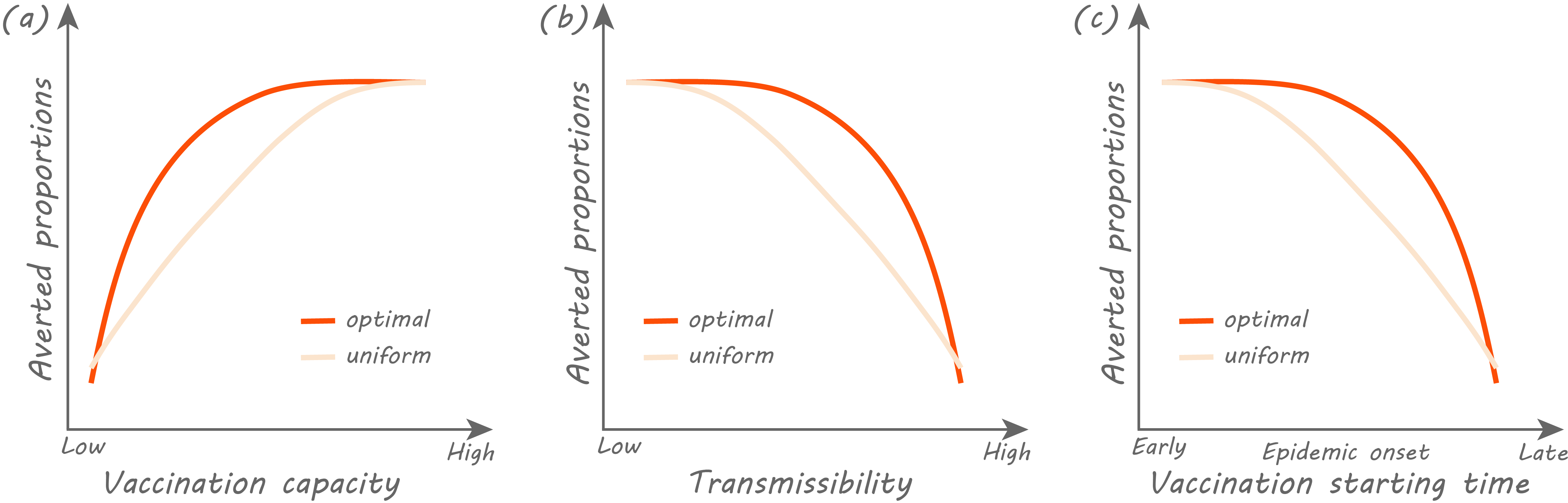 Credit: Jun Cai. Figure 1. Averted proportion of deaths for the uniform vaccination and the optimal strategies.