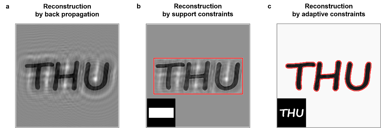 In our proposed scheme, an in-line digital holographic imaging configuration characterized by portability, low cost and high space-bandwidth product is considered to capture an intensity pattern. Adaptive constraints are generated according to the image on the object plane obtained by back-propagating from the captured hologram, adopting the Poisson distribution-based thresholding technique [5] and morphological operations including erosion and dilation. In conjunction with morphological operations which can extract the object structure while eliminating the irrelevant part such as artifacts and noise, adaptive constraints allow the support region to be accurately estimated and automatically updated at each iteration. The wave field propagating in the free space during the iteration process between the sensor plane and the object plane is calculated by the angular spectrum method [6]. The square root of a single captured intensity pattern is used to update the modulus of the diffracted wave field in the sensor plane, and the adaptive constraint updated iteratively is applied to confine the object wave field. Reconstruction by support constraints (Figure. 2b) enables to suppress artifacts outside the boundaries, but artifacts distributed within the support region still preserve, which significantly obfuscates the reconstruction. By contrast, reconstruction by adaptive constraints (Figure. 2c) obviously enhances the accuracy and efficiency of extracting the relevant image structures, and completely removes disturbance of twin-image artifacts.