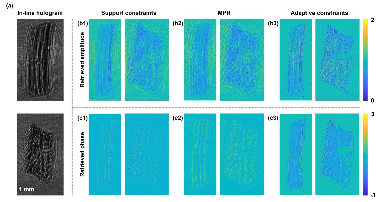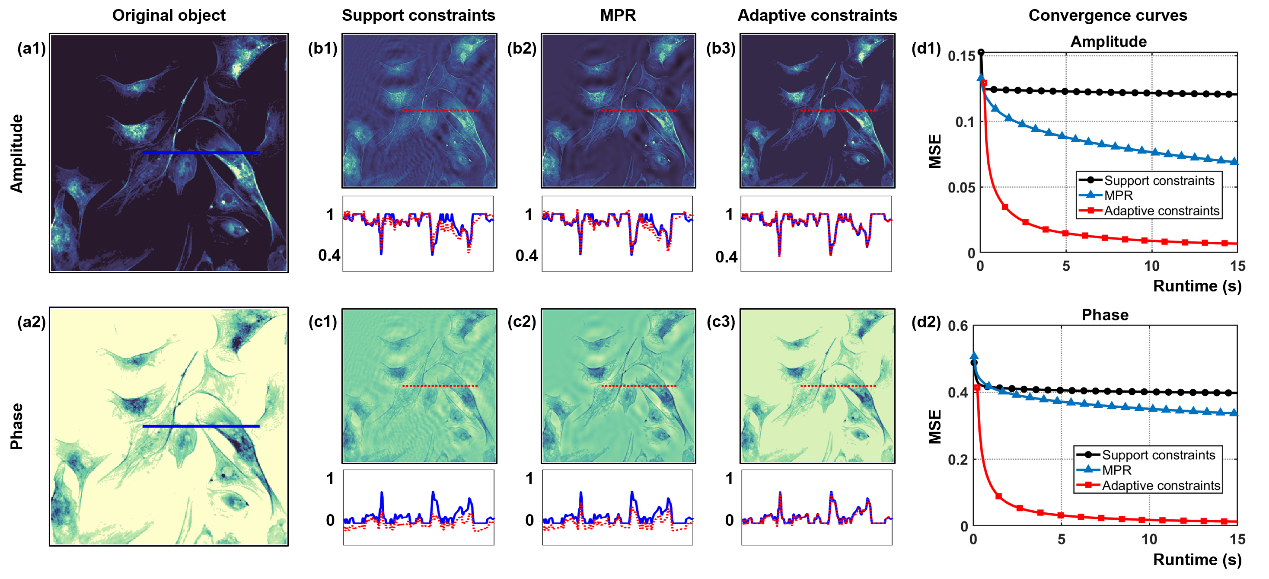 We go further to experimentally confirm the improved reconstruction performance of our proposed method by imaging the skeletal muscle cells sandwiched between glass plates (Figure. 4). By comparison, we can notice that imposing adaptive constraints enables to bring out a more distinguishable structure from an overwhelming incident light background, resulting in a better image contrast.