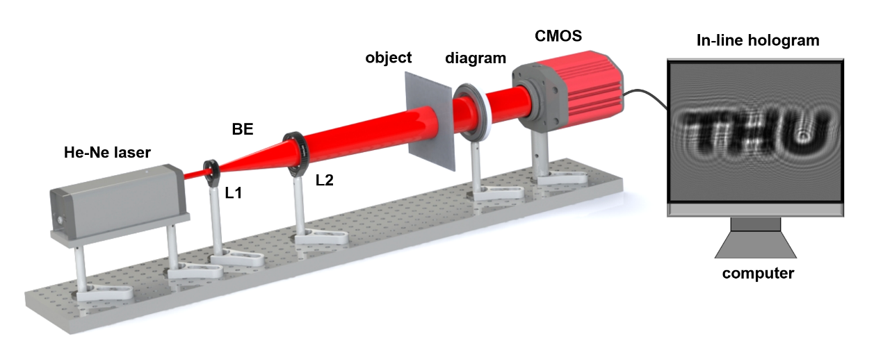 Figure 1 Optical configuration of an in-line holographic imaging system. BE, beam expander; L1-L2, lenses.