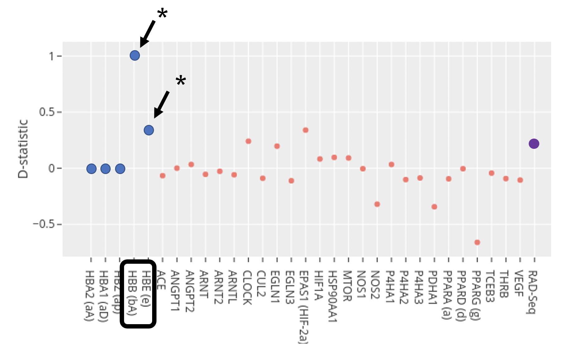 I assembled the contigs which contained the α- and β-globin complexes and annotated all genes (adult and embryonic) based on the mallard genome. Ultimately, I found both that the speckled teal and yellow-billed pintail had identical non-synonymous variation in the embryonic beta-globin gene (HBE; βε) as well as the adult (HBB; bA) gene! I then employed an ABBA-BABA test to assess whether the results we saw in the HIF-pathway, the globin genes, and genome-wide (i.e., RAD-Seq) to clarify what was going on. The results of that analysis showed evidence of introgression in the adult and embryonic β-globin genes, and nowhere else (see below; left, asterices = significance).