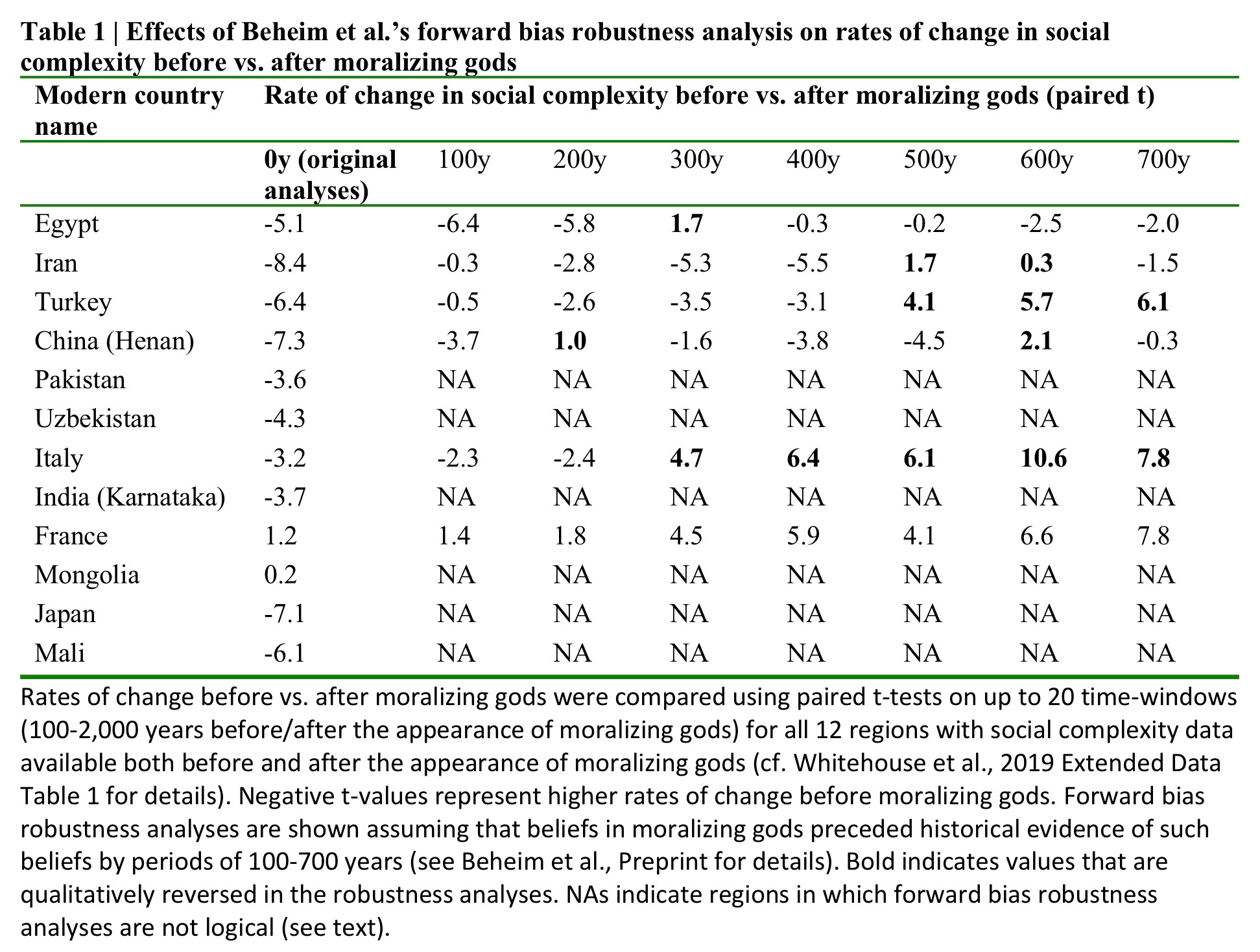 So, what happens if we restrict the robustness analysis of forward bias to only the 6 societies in which moralizing gods arose de novo in which forward bias might reasonably be a concern? Beheim et al. performed but appear not to report these reanalyses, so I have summarized them in Table 1. The first column is data we already reported in Extended Data Table 1 from our original paper. The other columns represent the same data when Beheim et al.’s robustness analyses are performed to examine the effect of possible forward bias in the 6 regions for which this is a reasonable concern. This table shows that potential forward bias of 100 years does not “reverse” the direction of findings for any of these six regions, 200 years reverses the findings for 1/6 regions, 300 years reverses the direction for 2/6 regions, and a minimum of 500 years of forward bias would be required to qualitatively reverse half (3/6) of the regions for which forward bias is a potential concern. Half a millennium is an extremely large margin of error, suggesting that our results are highly robust!