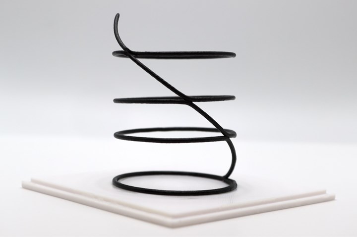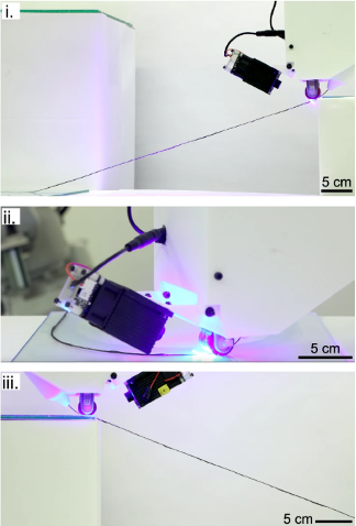One of the most compelling outcomes of this work was the integration of the process with a 6-axis robotic arm (Figure 2). By enabling precise, programmable control over the location and timing of cure, the system supports freeform fabrication without the need for support structures or molds.