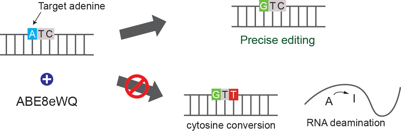 We found several key residues associated with cytosine binding. However, replacing these residues also lowered the adenine editing activity. We wanted engineered ABEs to maintain their own efficiency of converting adenine. Fortunately, two papers were published.10, 11 Each paper developed the ABE8 version for better activity! We rapidly introduced the key mutation on the ABE8 version. We finally found that engineered ABE, ABE8eWQ efficiently edited adenine with reduced bystander cytosine conversion. In addition, the key mutation, D108Q, is also related to the affinity of binding with RNA. ABE8eWQ reduced promiscuous RNA deamination as well as cytosine conversion. (Figure 1)